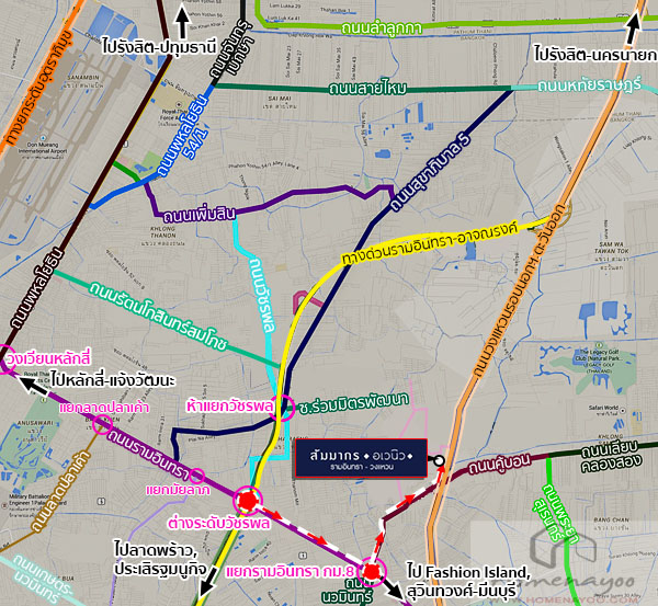 การเดินทางเริ่มจากถนนรามอินทรา ⇒ ถนนคู้บอน ⇒ ทางขนานถนนกาญจนาภิเษกฯ ⇒ 600 ม. ⇒ สัมมากร อเวนิว รามอินทรา-วงแหวน