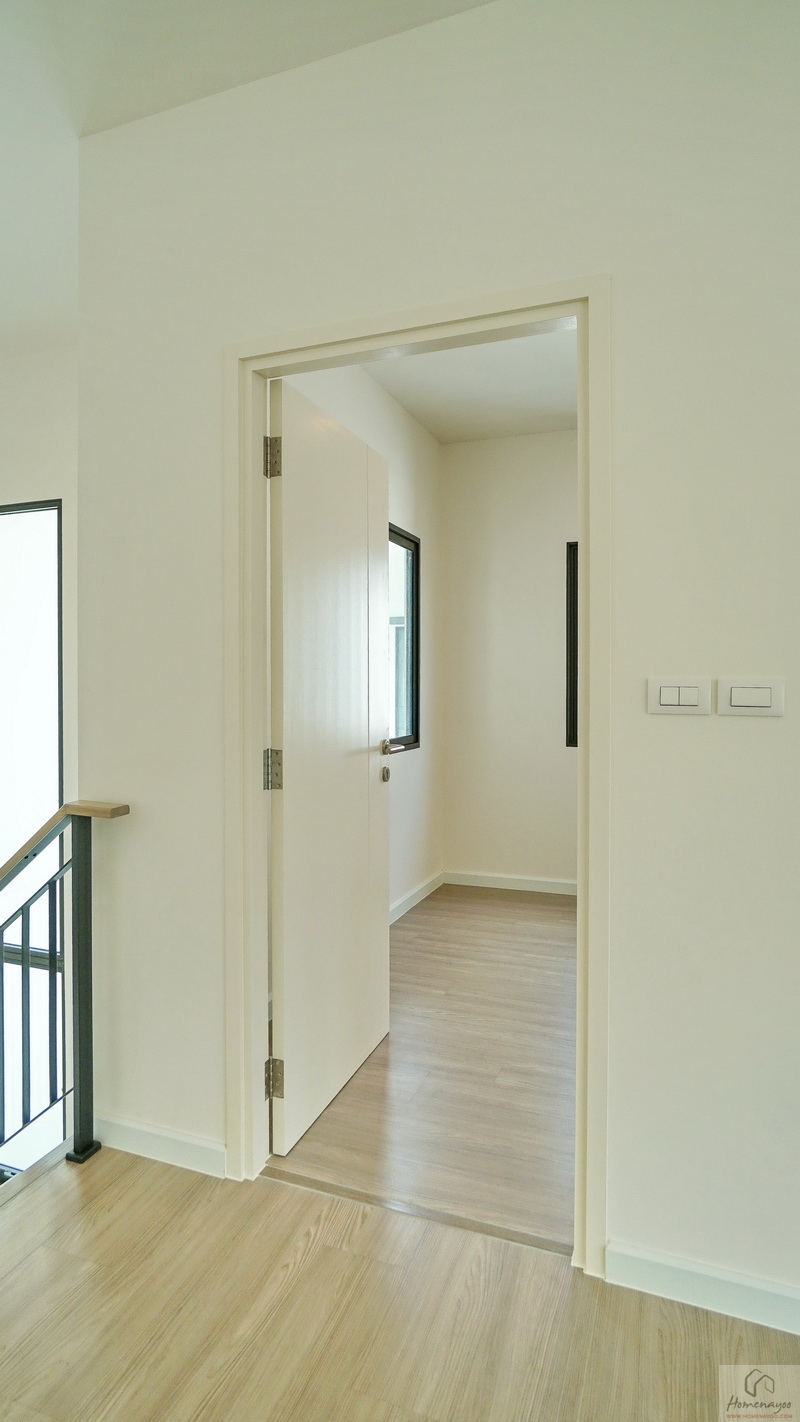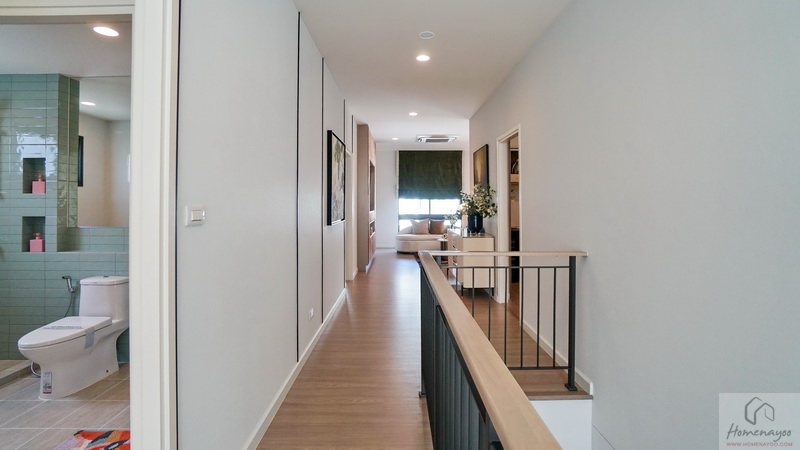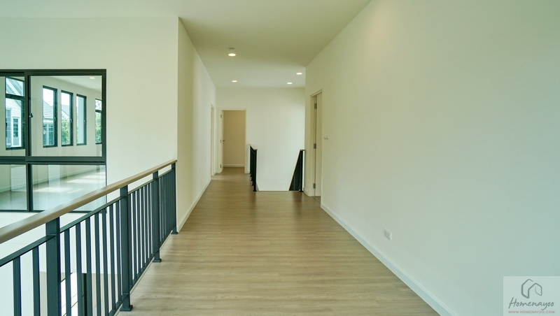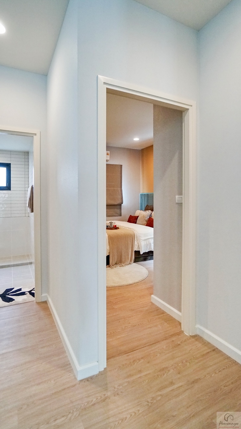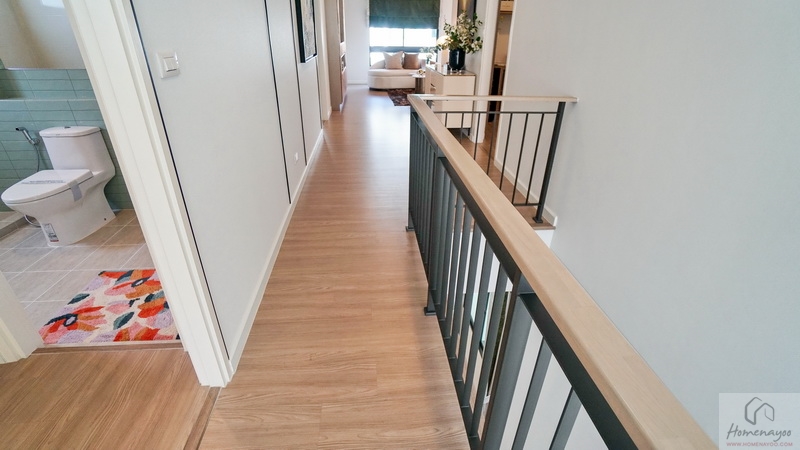 ขึ้นมาชั้น 2 ของตัวบ้านจะเจอโถงทางเดินแนวยาวเชื่อมไปยังส่วนต่าง ๆ ชั้นบนปูพื้นลามิเนตลายไม้ เพดานสูง 2.7 ม. สุดโถงทางเดินจะเป็น Family Area ฝั่งหน้าบ้านคือ Master Bedroom และฝั่งหลังบ้านเป็นห้องนอน 2 และห้องนอน 3 ทุกห้องมีห้องน้ำในตัว