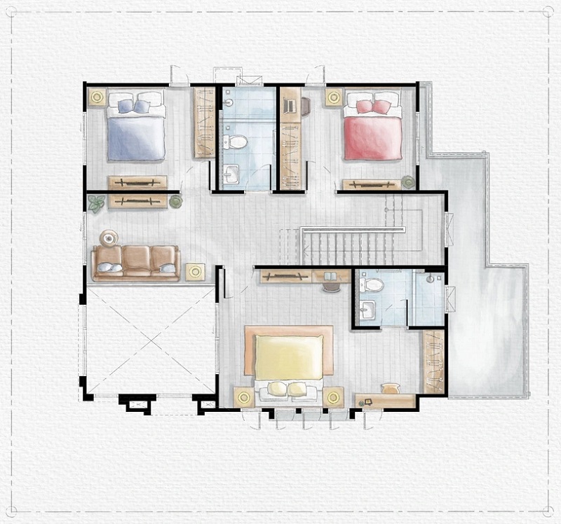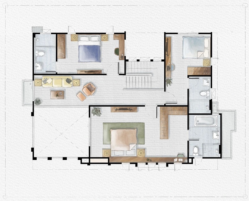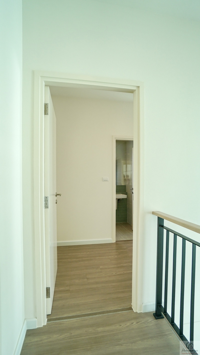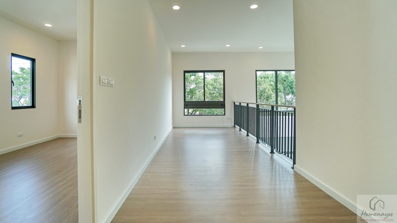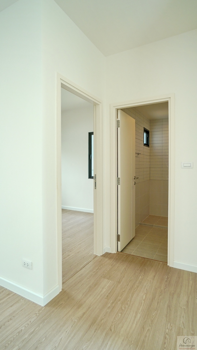 ขึ้นมาชั้น 2 ของตัวบ้านจะเจอโถงทางเดินแนวยาวเชื่อมไปยังส่วนต่าง ๆ ชั้นบนปูพื้นลามิเนตลายไม้ เพดานสูง 2.7 ม. สุดโถงทางเดินจะเป็น Family Area ฝั่งหน้าบ้านคือ Master Bedroom และฝั่งหลังบ้านเป็นห้องนอน 2 และห้องนอน 3 ทุกห้องมีห้องน้ำในตัว