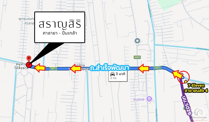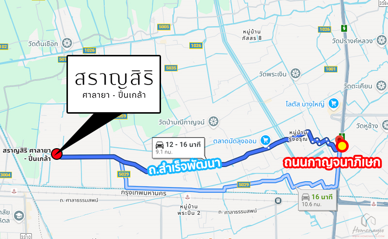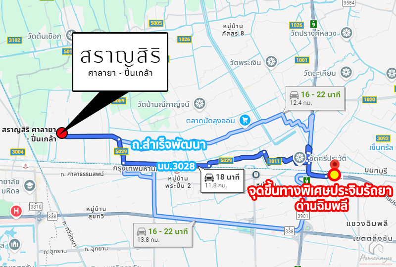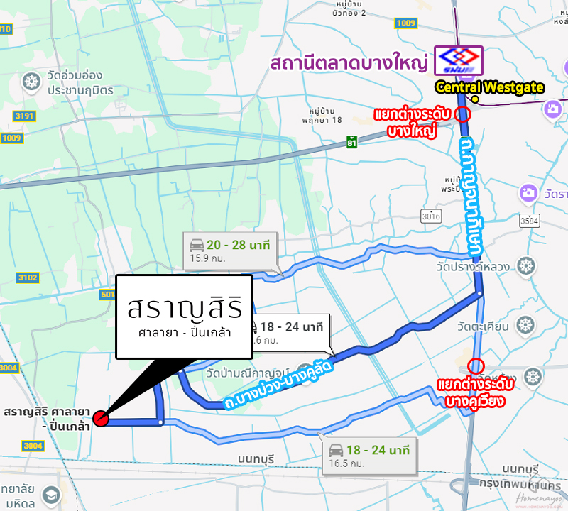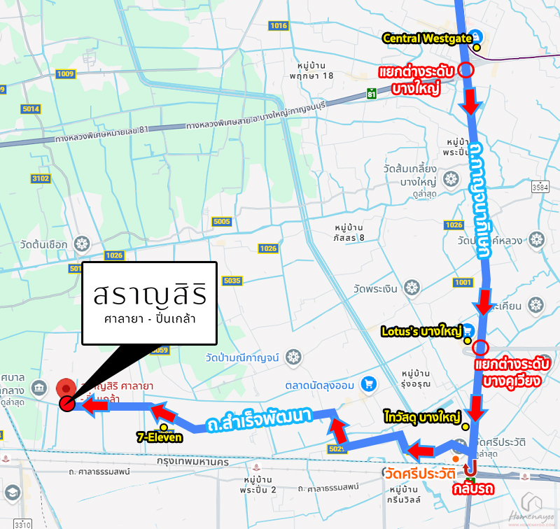 การเดินทางเริ่มจาก ถนนกาญจนาภิเษก (ช่วง Central Westgate ฝั่งมุ่งหน้าไปบางแค) ⇒ กลับรถเข้าซอยวัดศรีประวัติ ⇒ ทางหลวงชนบท นบ.3028 ⇒ ถนนสำเร็จพัฒนา ⇒ สราญสิริ ศาลายา-ปิ่นเกล้า