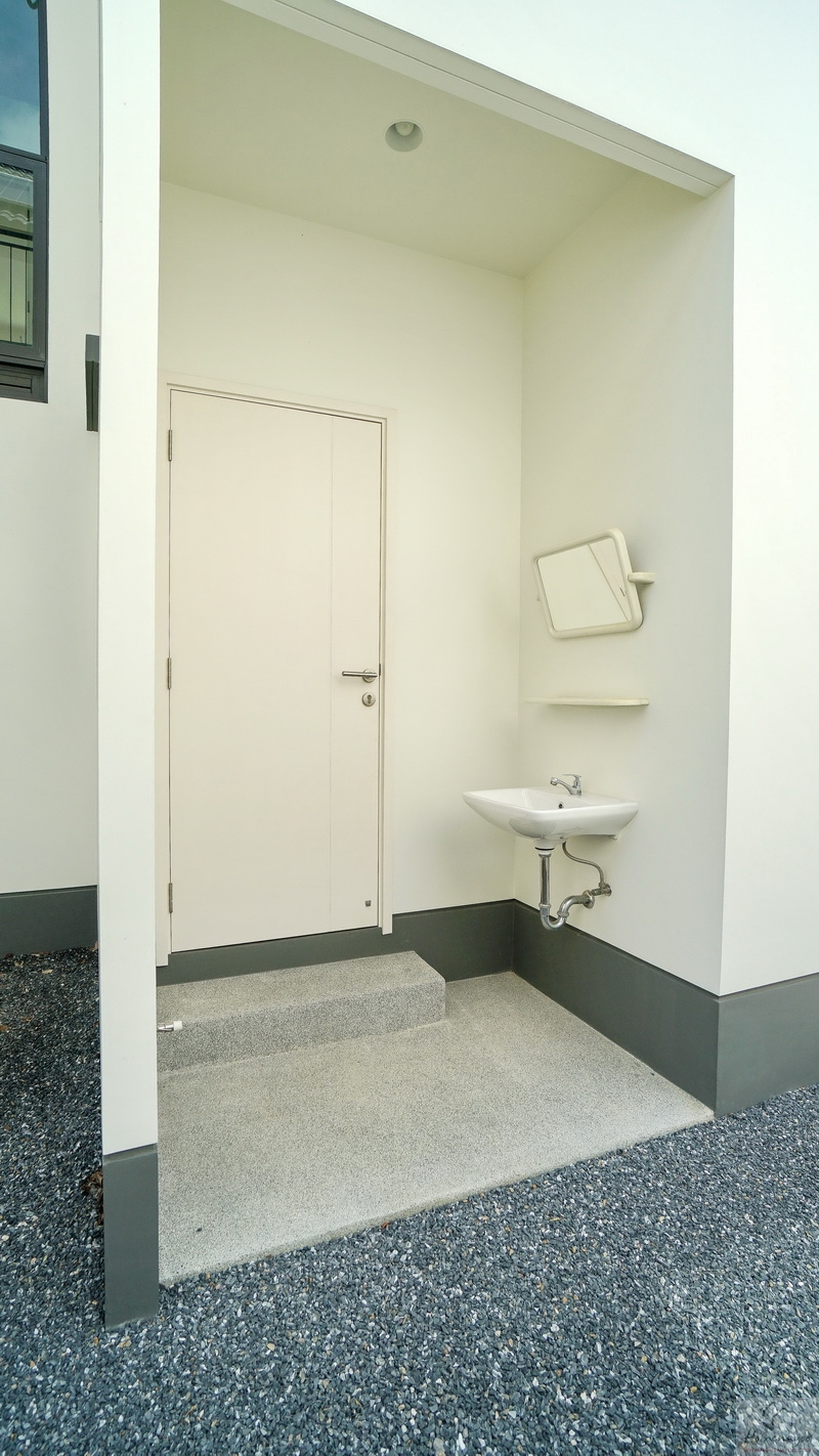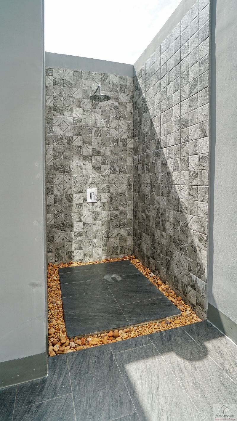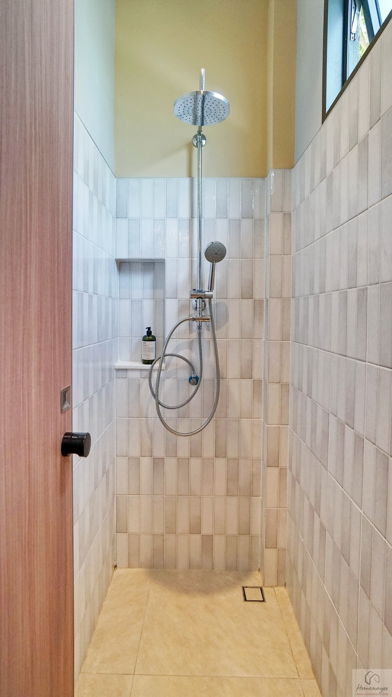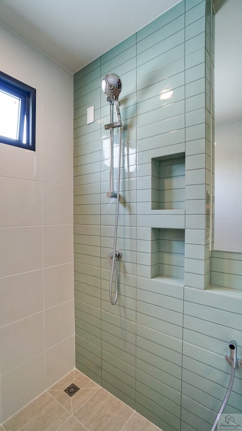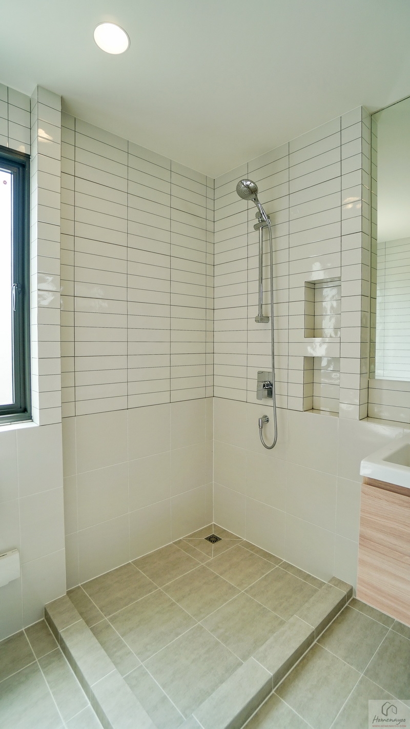ถัดเข้าไปคือมุมอาบน้ำที่แยกส่วนแห้ง-ส่วนเปียกด้วยขอบธรณี จุดนี้สามารถติดตั้งฉากหรือม่านกั้นเพิ่มเติมได้ ด้านในใช้ฝักบัว Hand Shower เจาะผนังด้านข้างแล้วทำเป็นที่วางของใช้ให้ 2 Step บนผนังเดินงานระบบไฟฟ้ามี Junction Box รองรับการติดตั้งเครื่องทำน้ำอุ่นเพิ่มเติม