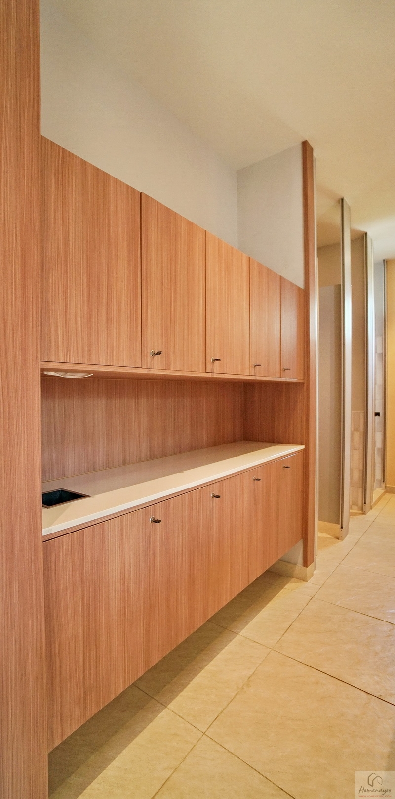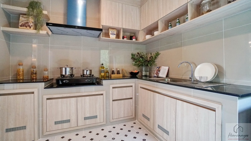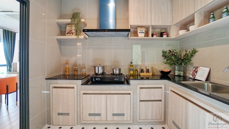 ทางโครงการ Built-in เคาน์เตอร์ครัวปูนขนาดกำลังดีแบบ L-Shape ท็อปด้วยหินสังเคราะห์สีเข้ม มีตู้เก็บของบานปิดลายไม้พร้อมช่องระบายอากาศที่ด้านล่าง ฟังก์ชันครบทั้งส่วนเตรียมอาหาร, ส่วนทำอาหารที่ลดระดับลง 1 Step, ฮูดดูดควัน และซิงค์ล้างจาน พร้อมติดตั้งตู้เก็บของเข้าชุดกันที่ด้านบน