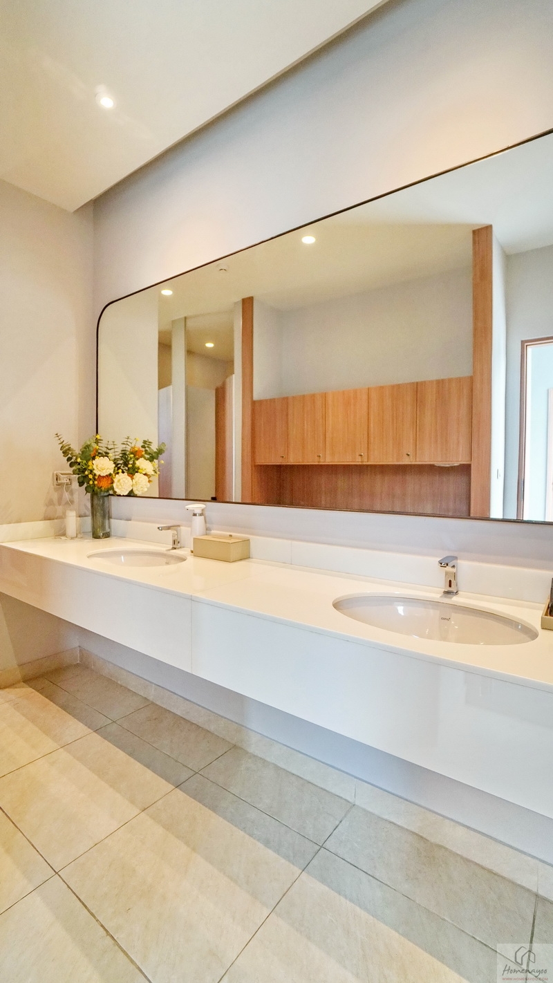 ฝั่งซ้ายคือโซนอ่างล้างหน้าแบบ His & Her คู่รักใช้งานร่วมกันได้สะดวก อ่างล้างหน้าใช้ทรงเหลี่ยมแบบฝังบนตู้เก็บของลายไม้ ด้านหลังก่อเป็น Low Wall วางของใช้หรือของตกแต่งได้เยอะ บนผนังติดกระจกเงาทรงสี่เหลี่ยมบานใหญ่ไว้ให้ 1 บาน
