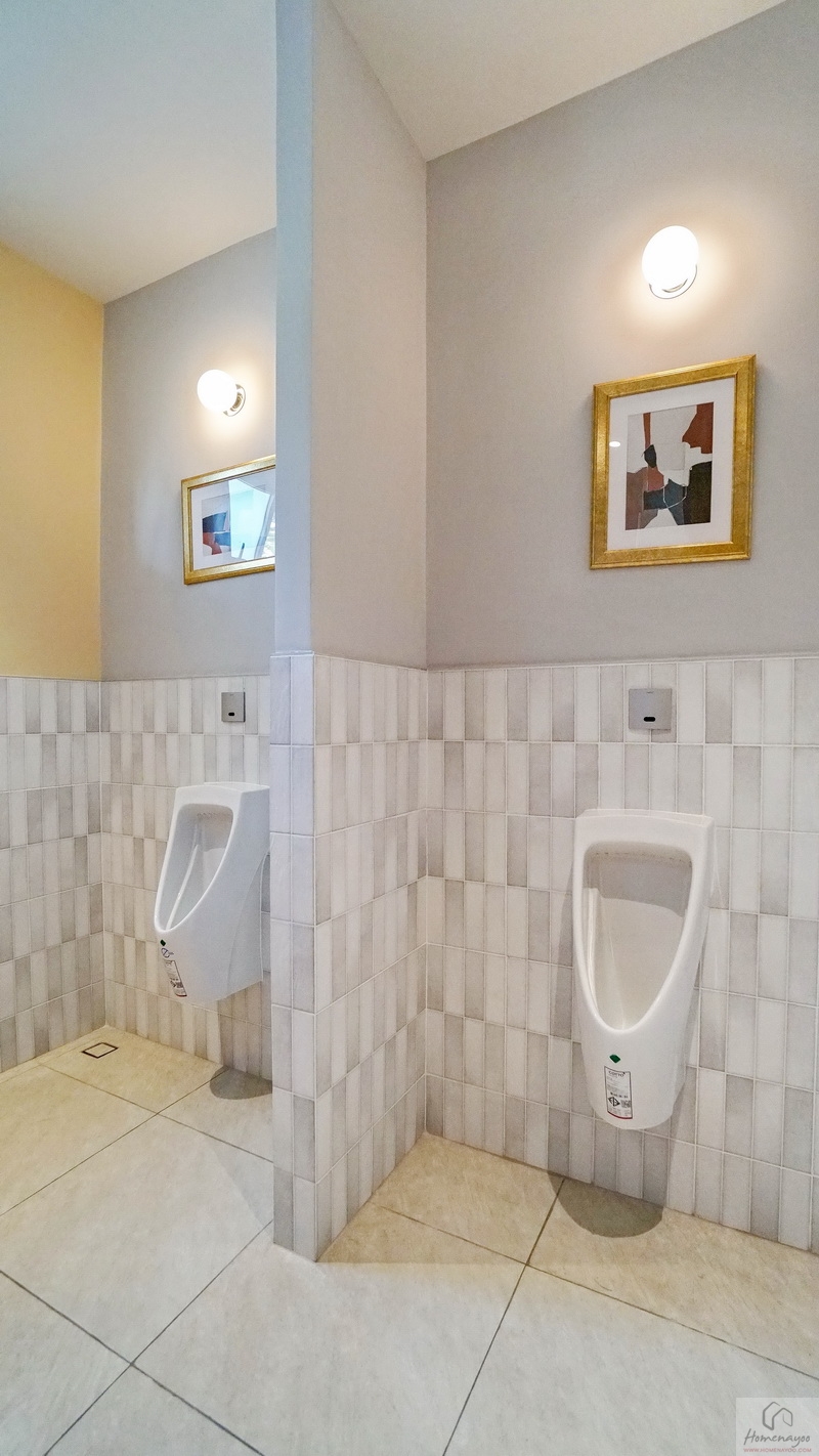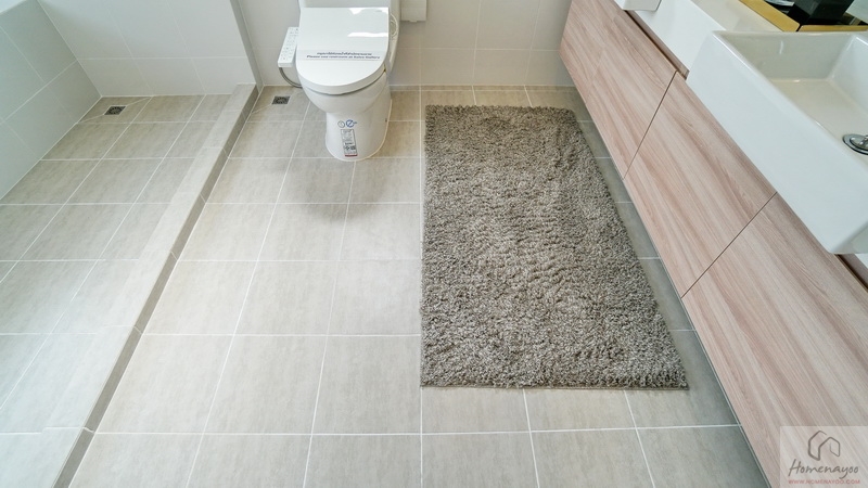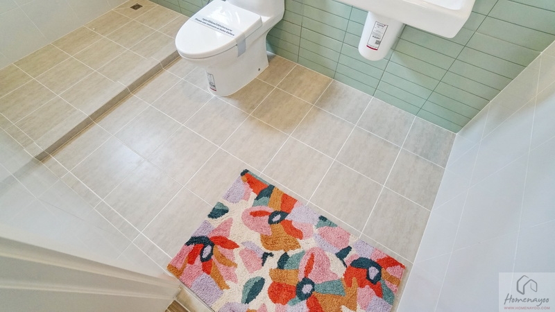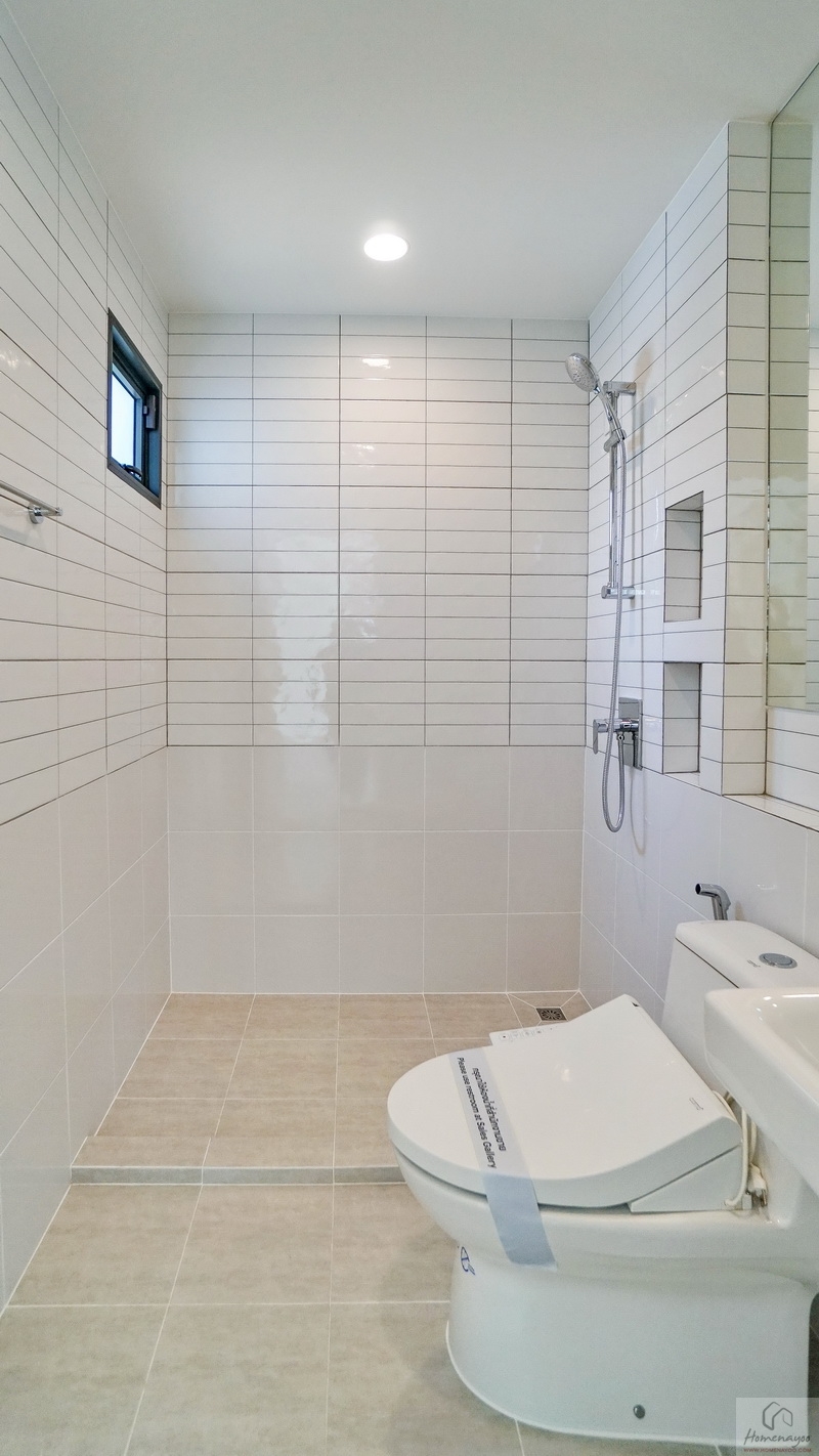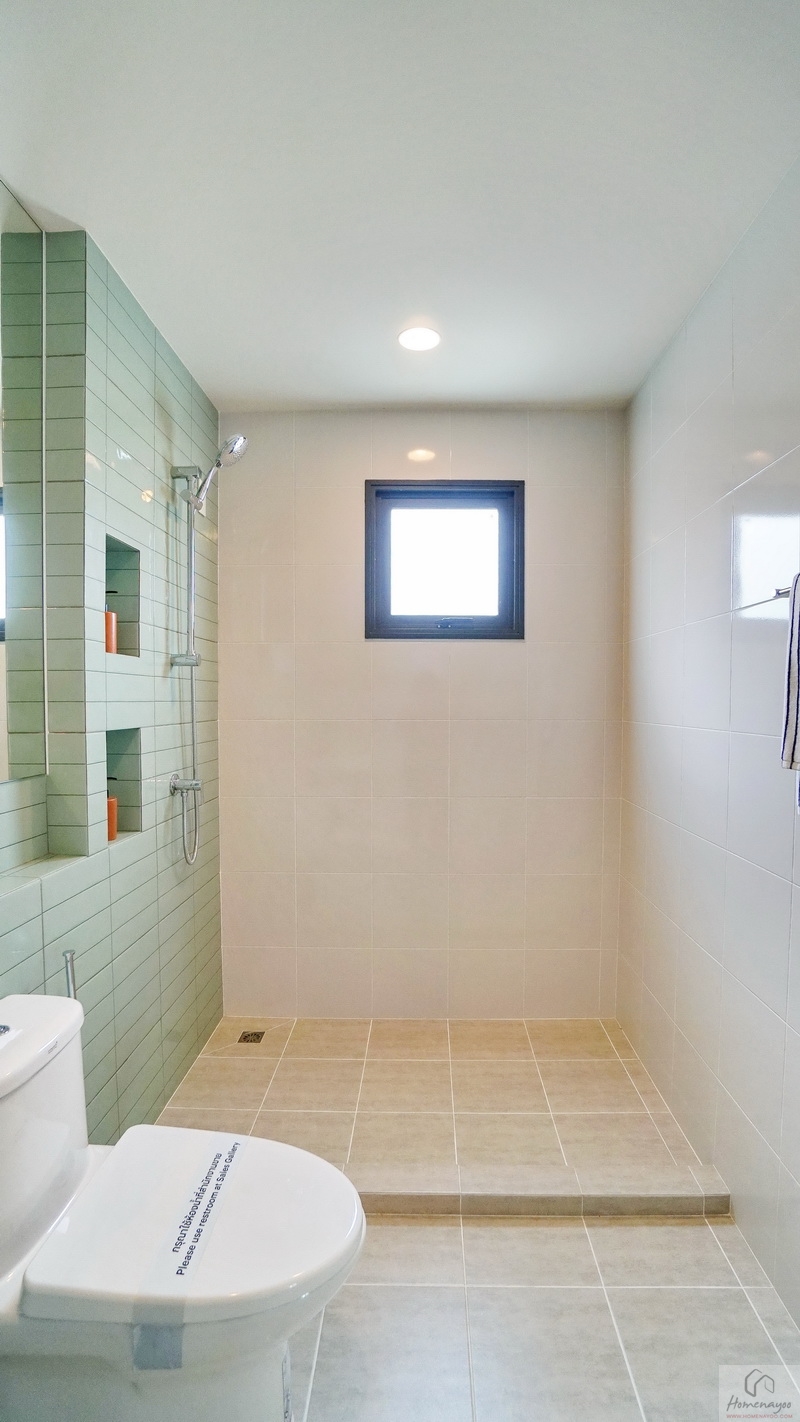 พื้นที่ใช้งานกว้างจัดฟังก์ชันครบทั้งส่วนแห้ง-ส่วนเปียก ตกแต่งพื้นและผนังด้วยกระเบื้องโทนสีขาว-เทา แซมด้วยกระเบื้องโทนสีเขียว Pastel สุขภัณฑ์มาตรฐานใช้ของ COTTO หรือเทียบเท่า มีหน้าต่างกระจกฝ้าบานกระทุ้งช่วยระบายอากาศให้ 1 บาน