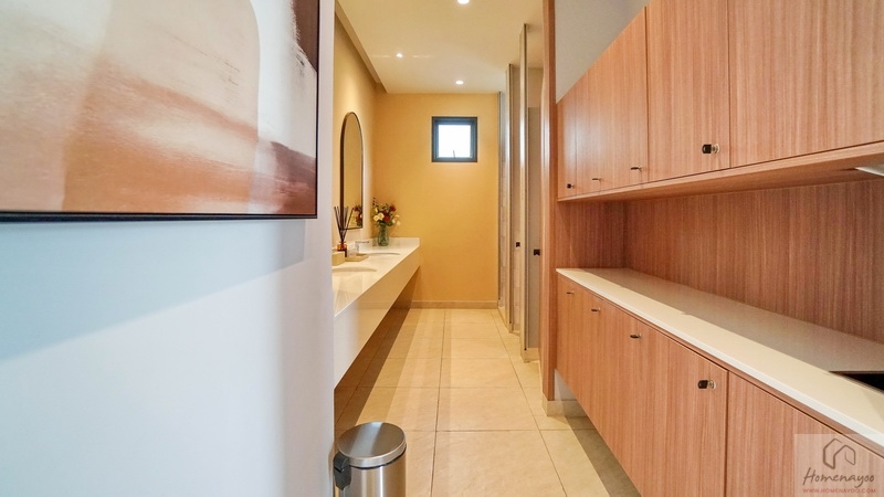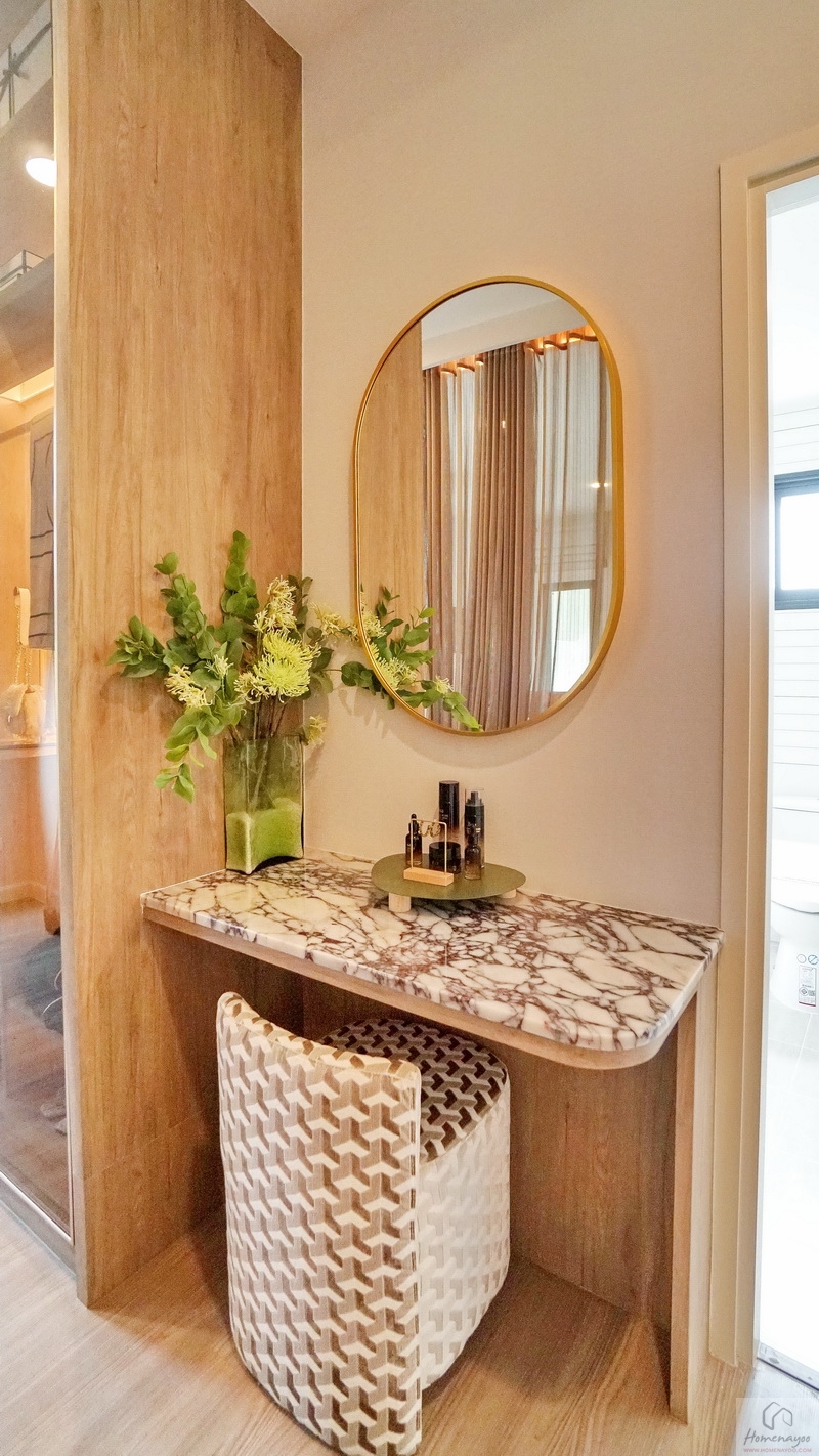 ใกล้กันจัดเป็นมุมโต๊ะเครื่องแป้งขนาดมาตรฐาน 1 ที่นั่ง พื้นด้านล่างเหลือกว้างให้ยืนแต่งตัว, นั่งแต่งหน้า หรือเดินเข้า-ออกห้องน้ำได้สะดวก