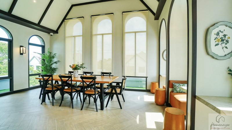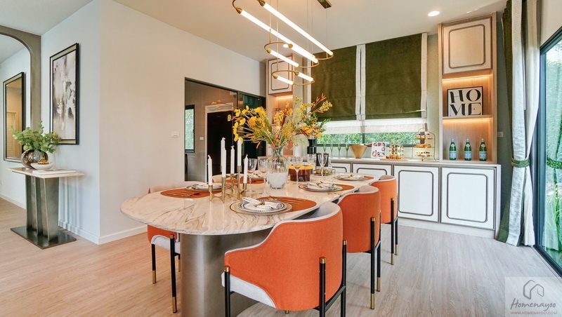 ถัดจาก Living Area เชื่อมต่อกันคือ Dining Area จัดวางชุดรับประทานอาหารทรงกลมหรือทรงเหลี่ยมขนาด 6-8 ที่นั่งได้สบาย ๆ