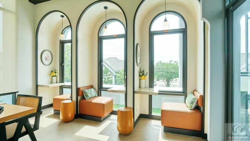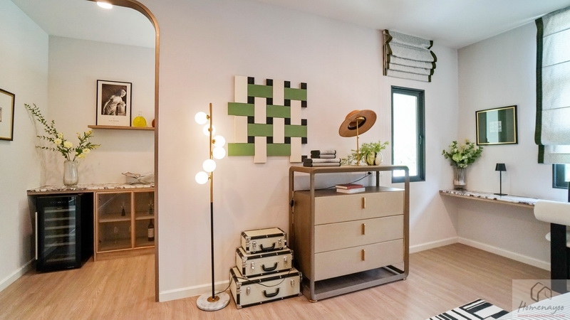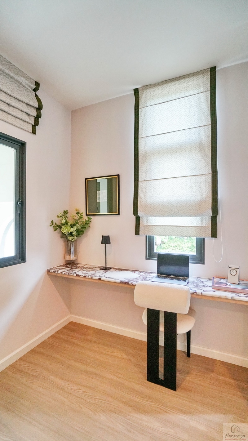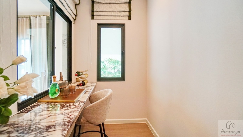 ซ้ายสุดของห้องคือพื้นที่อเนกประสงค์สำหรับจัดเป็นห้องทำงานส่วนตัว หรือจะปรับฟังก์ชันได้ตามไลฟ์สไตล์ของแต่ละบ้าน มีหน้าต่างให้ 2 ชุด ช่วยให้พื้นที่ไม่แออัด โปร่ง โล่ง รับวิวได้ดี บ้านตัวอย่างจัดมุม Cocktail ส่วนตัวให้ดูเป็นไอเดีย