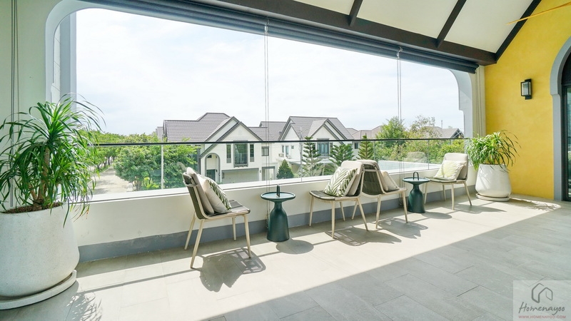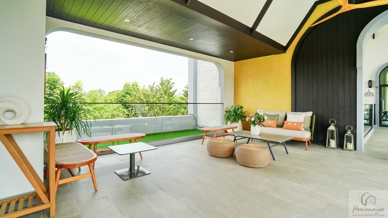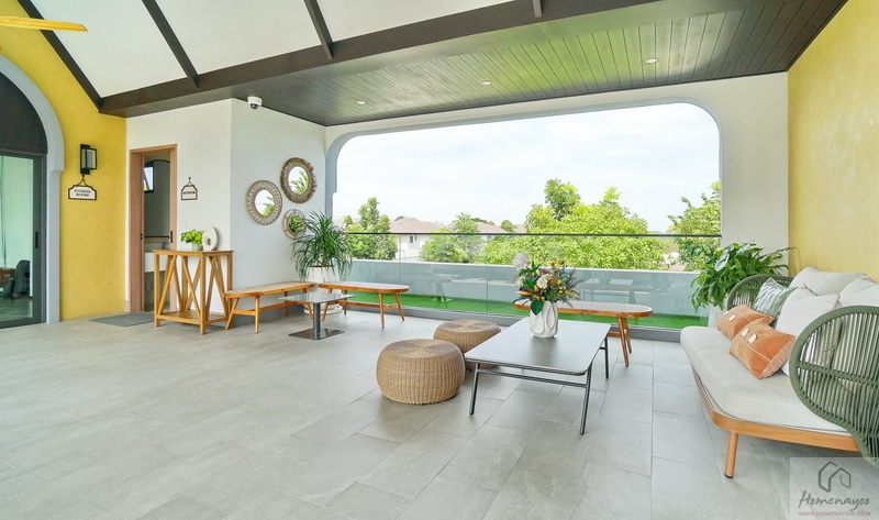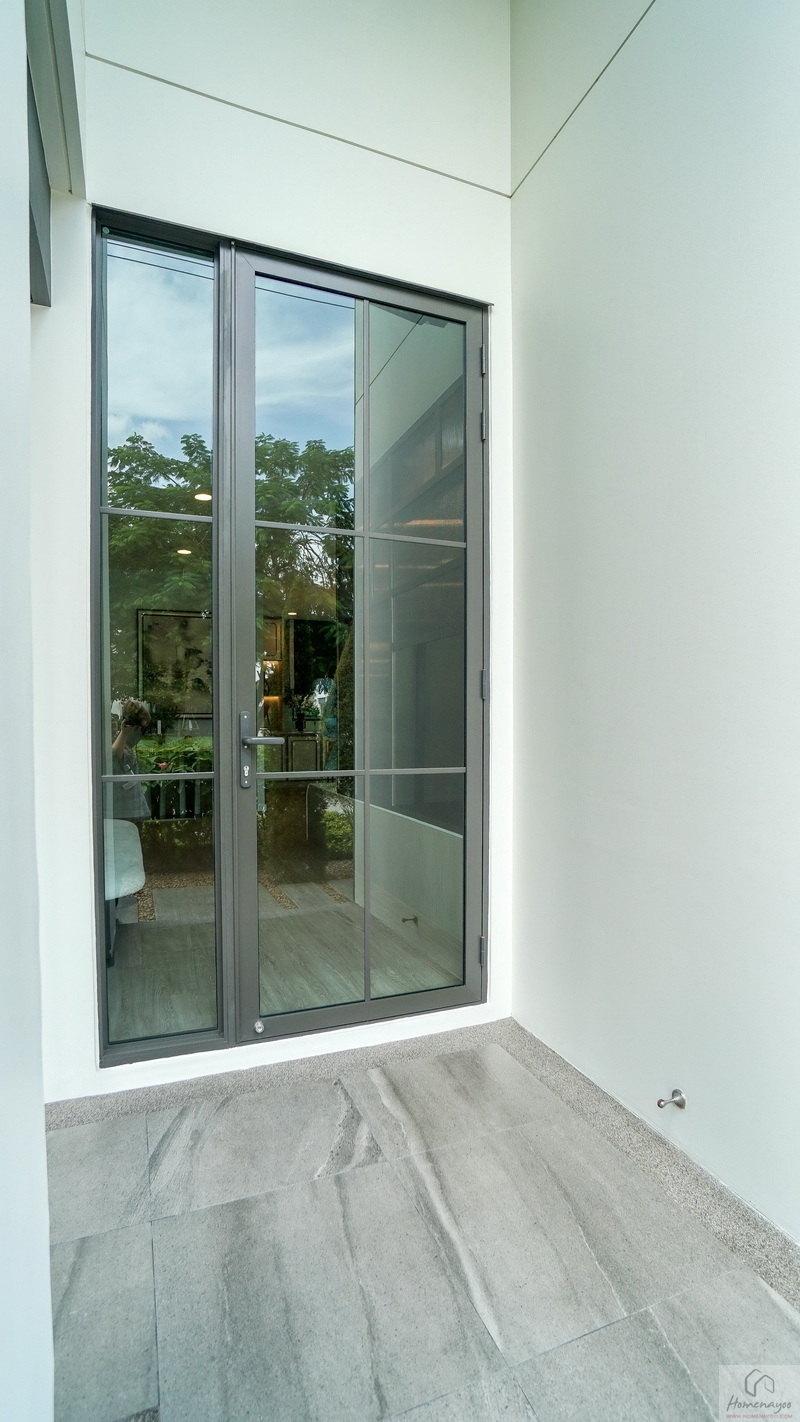 พื้นที่ระเบียงชมวิวกว้างกำลังดี ประตูบานใหญ่ใช้เปิดรับแสงรับลมหรือระบายอากาศได้ สามารถจัด Pocket Garden เสริมบรรยากาศให้กับตัวบ้านได้