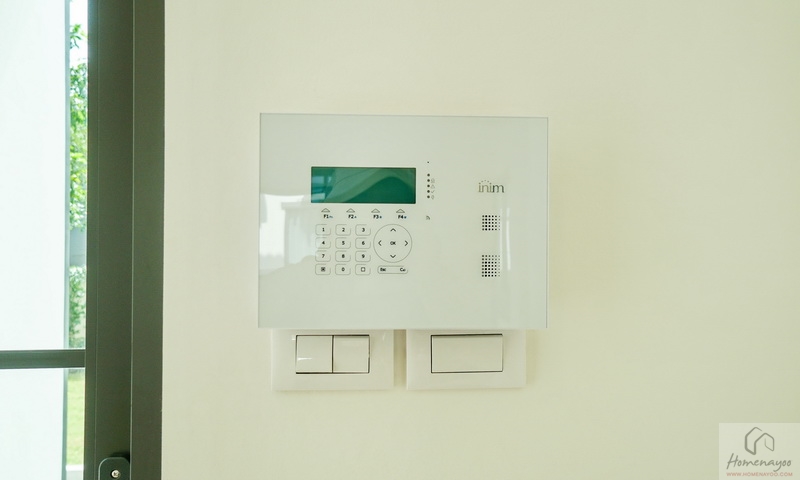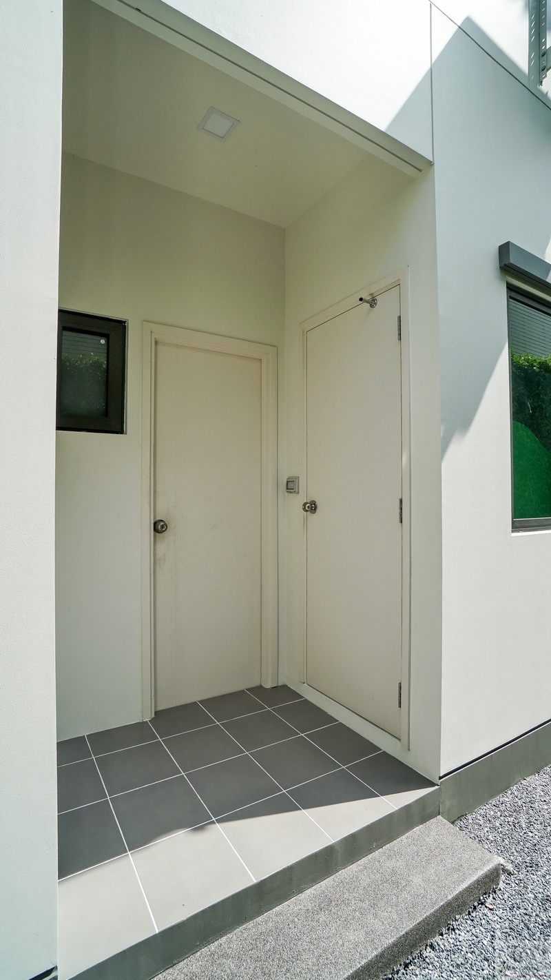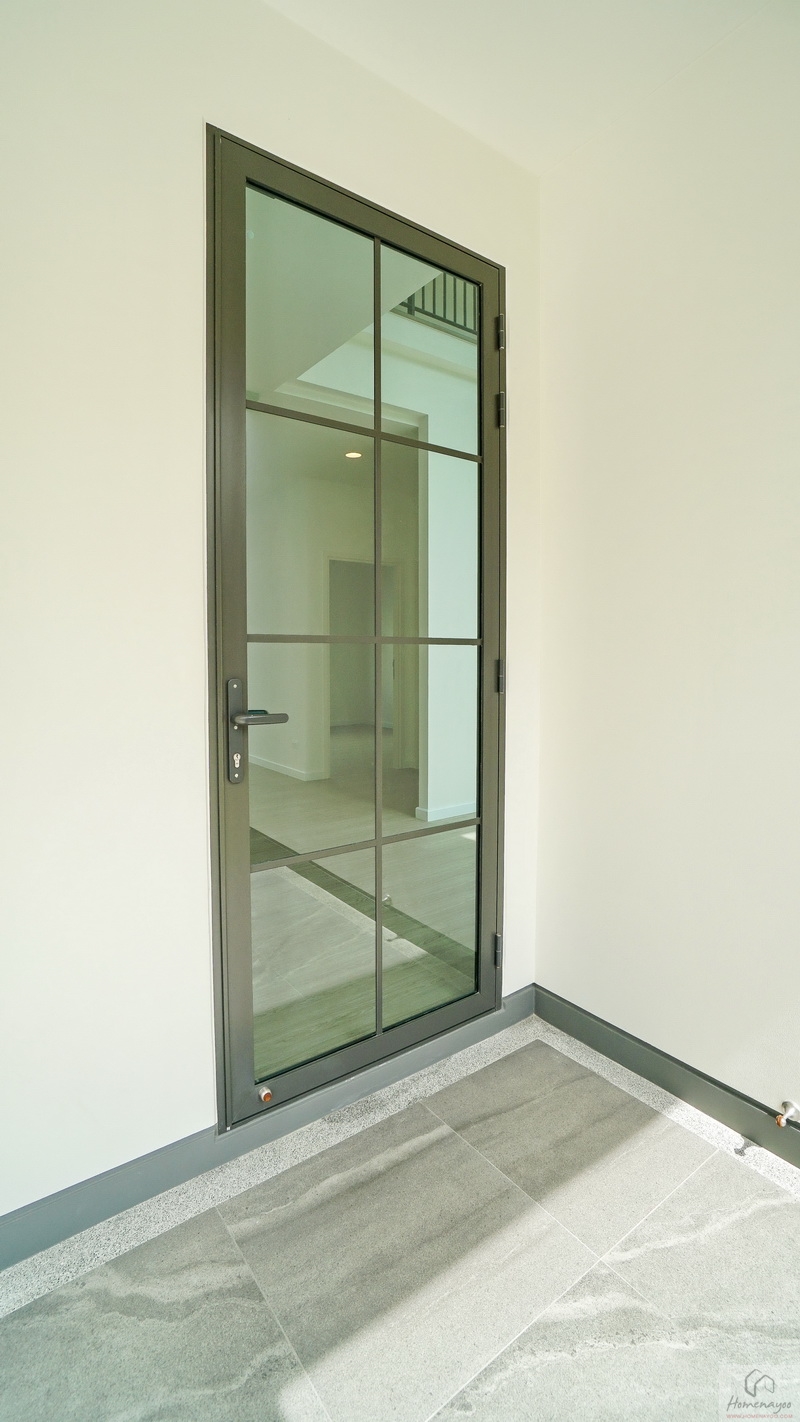 กลับมาดูบริเวณประตูทางเข้าหลักกันต่อ ประตูบ้านใช้เป็นบานเปิดกระจกเขียวตัดแสงลายตารางลูกฟักกรอบสีเทาดำขนาดใหญ่กว่าของบ้าน Type กลาง พร้อมมีช่องแสงเพิ่มเติมให้ที่ด้านข้าง โดยประตู-หน้าต่างชั้นล่างทุกบานจะมีการติดตั้งระบบสัญญาณกันขโมย Magnetic Wireless Sensor มาให้