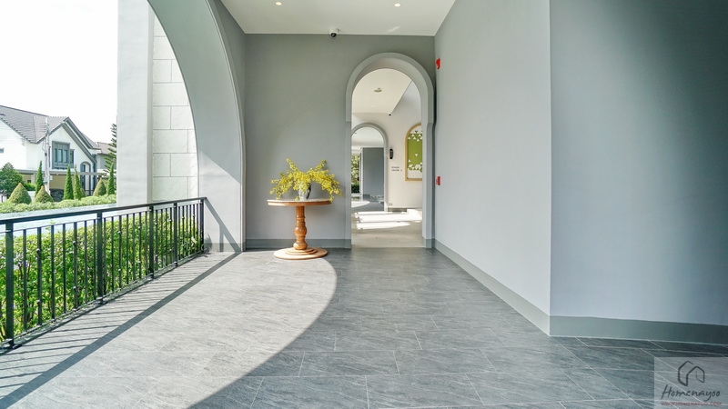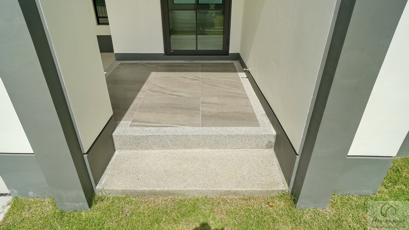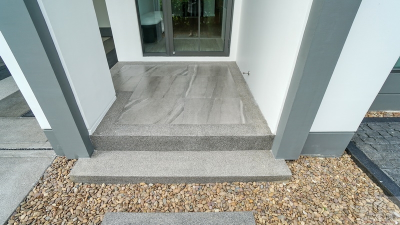 เฉลียงบ้านกว้างยกพื้นขึ้นมา 2 Step พื้นปูกระเบื้องโทนสีเทาผสมกับพื้นทรายล้างสวยงาม