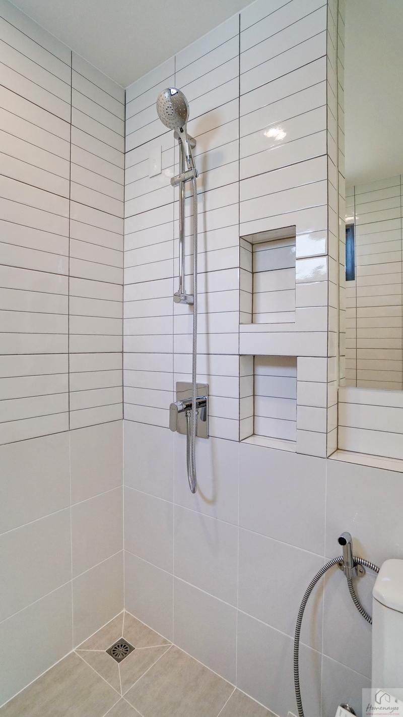 ถัดมาคือมุมอาบน้ำใช้ฝักบัว Hand Shower มีราวปรับระดับสูง-ต่ำ ด้านข้างเจาะผนังเป็นที่วางของใช้ให้ 2 Step บนผนังมีการเดินงานระบบไฟฟ้าติด Junction Box รองรับการติดตั้งเครื่องทำน้ำอุ่น บริเวณนี้เราสามารถติดตั้งฉากหรือม่านกั้นเพิ่มเติมได้
