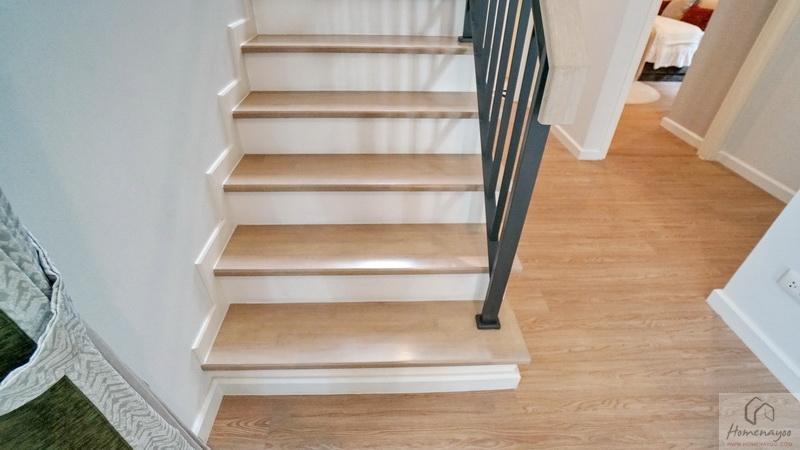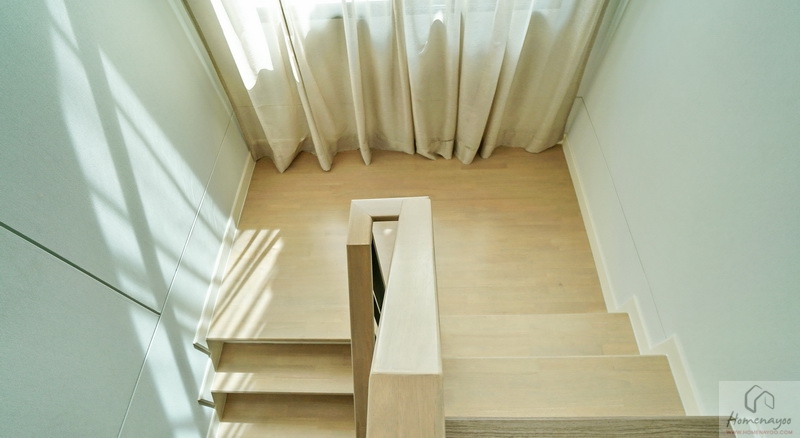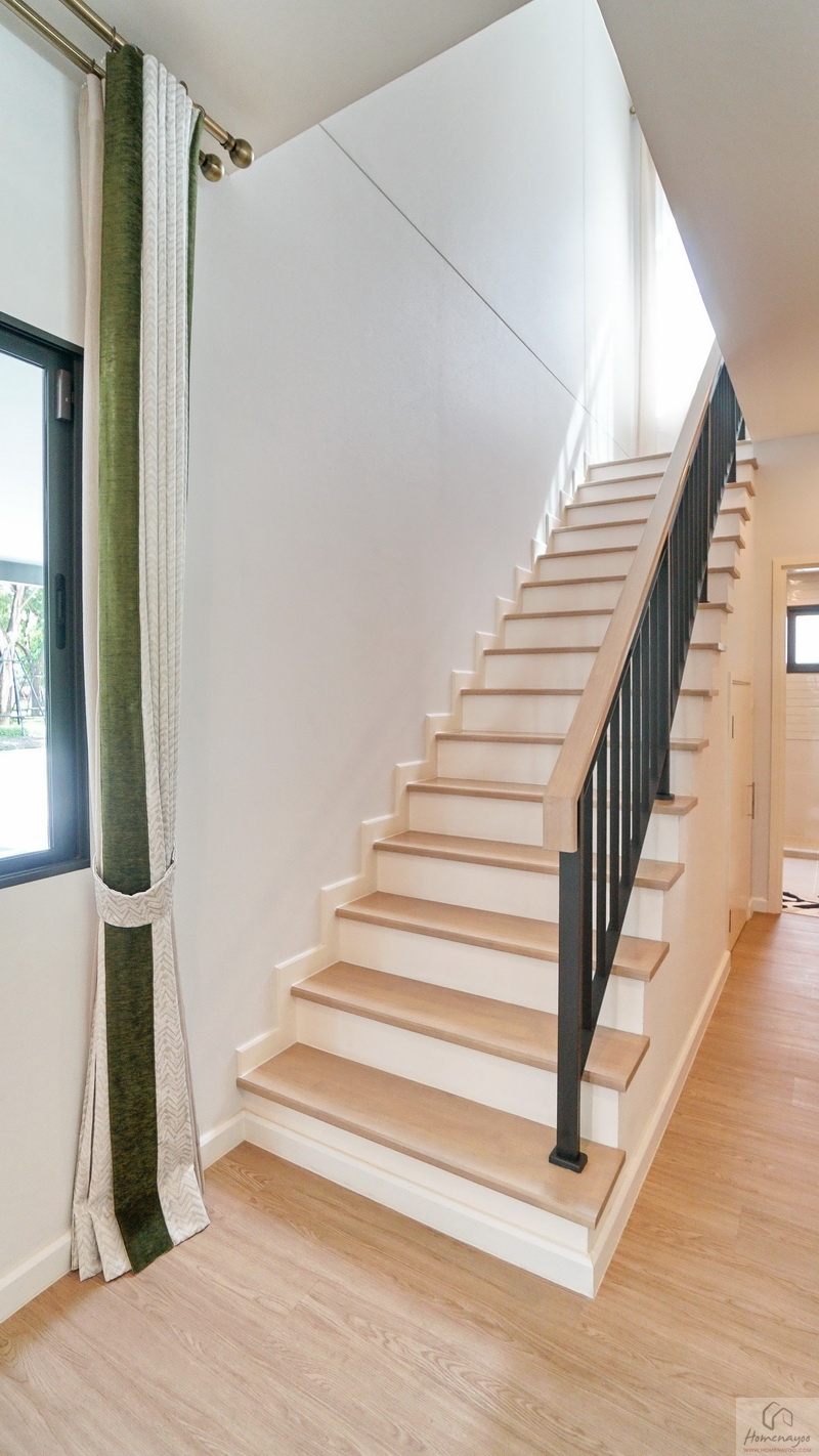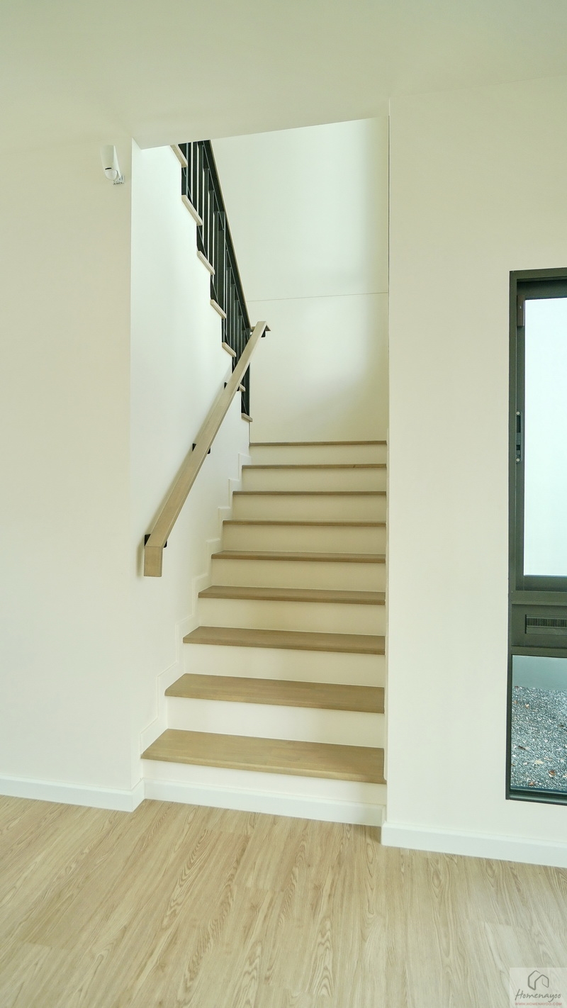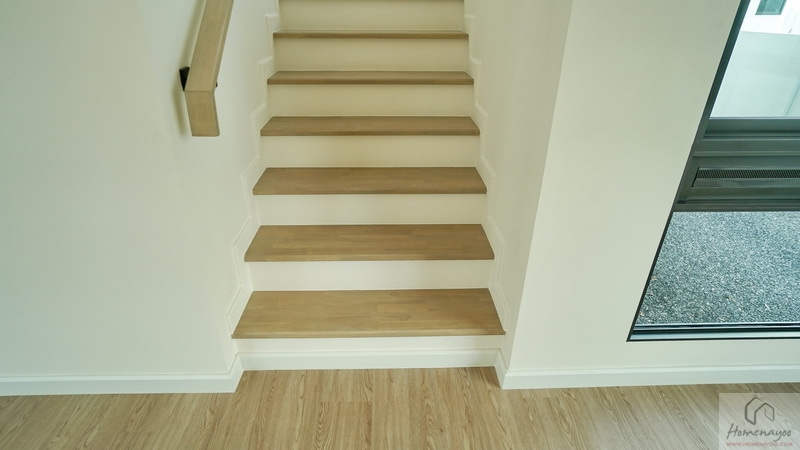 บันไดบ้านโครงสร้างคอนกรีตเสริมเหล็กเดินขึ้น-ลงเสียงจะไม่ดัง ลูกนอนปิดผิวด้วยไม้ยางพาราอัดประสานสำเร็จรูป ลูกตั้งฉาบเรียบทาสี