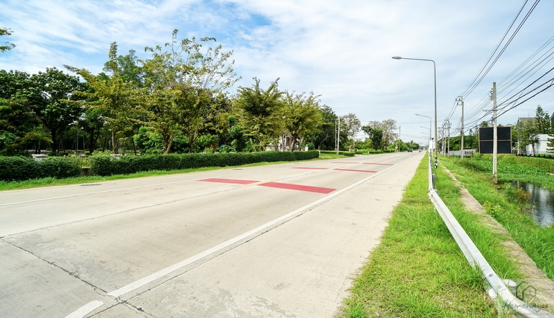 ถนนเมนคั่นด้วยเกาะกลางถนนที่ลงพุ่มไม้ดอกไม้ประดับและต้นไม้ใหญ่ให้ความร่มรื่นไว้ตลอดเส้นทาง ให้มุมมองคล้ายอุโมงค์ต้นไม้ดูเป็นธรรมชาติ พร้อมเว้นช่องว่างสำหรับกลับรถหรือออกจากซอยอยู่เป็นระยะ ๆ