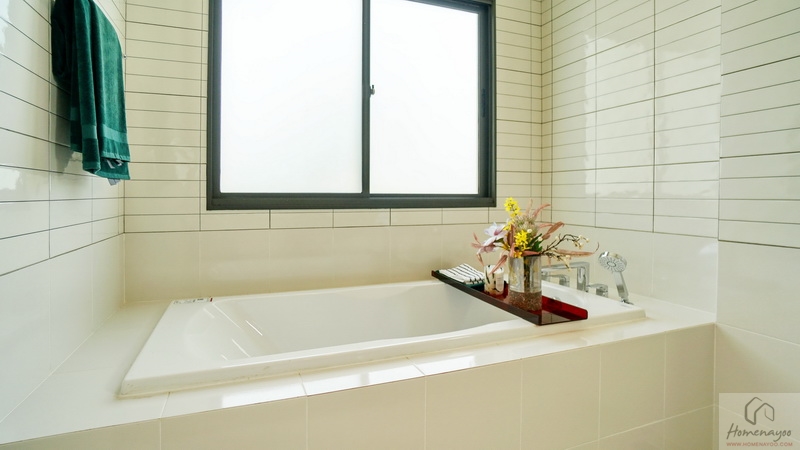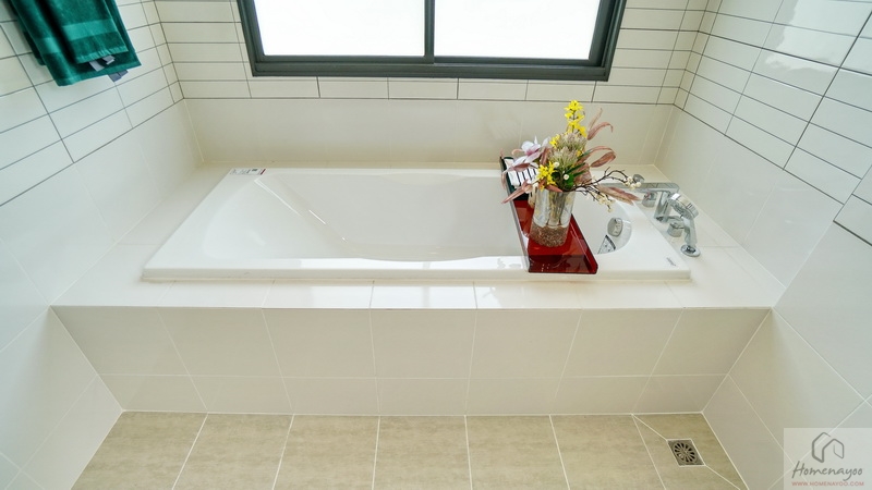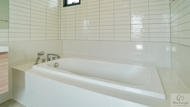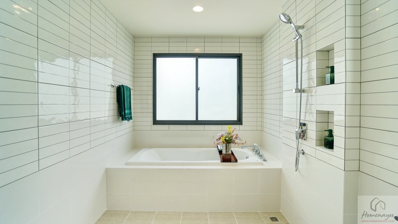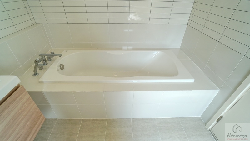 อีกฝั่งของห้องคือมุมอ่างอาบน้ำแบบฝัง (Built-in Bathtub) ด้านข้างมีราวแขวนผ้าเช็ดตัวมาให้ บริเวณนี้มีหน้าต่างกระจกฝ้าบานใหญ่ให้ 1 ชุด