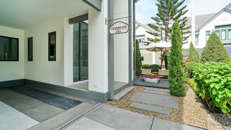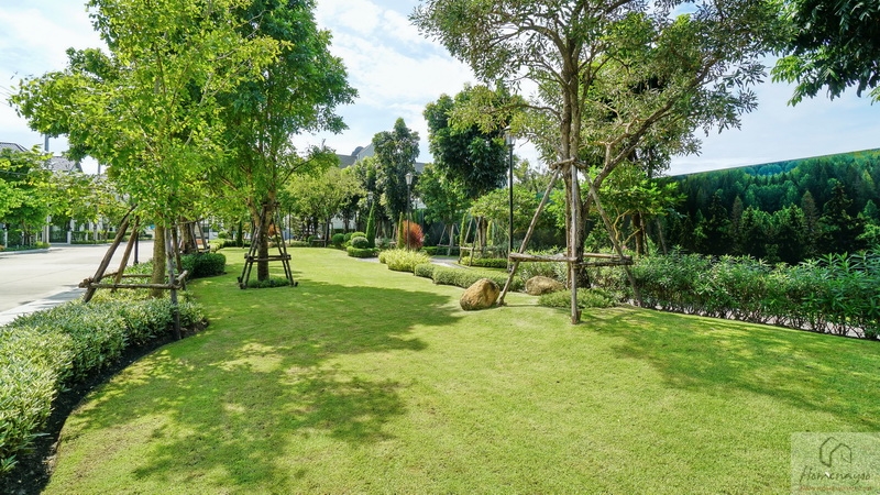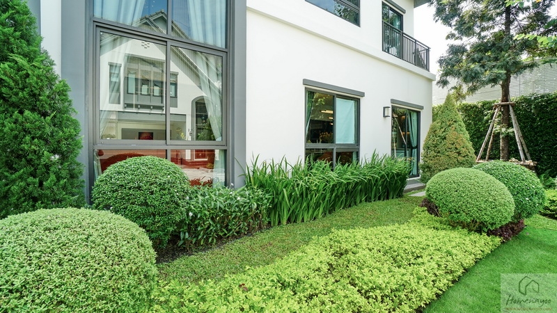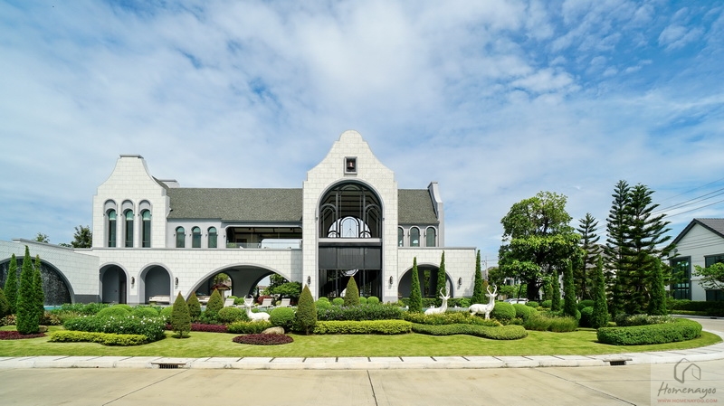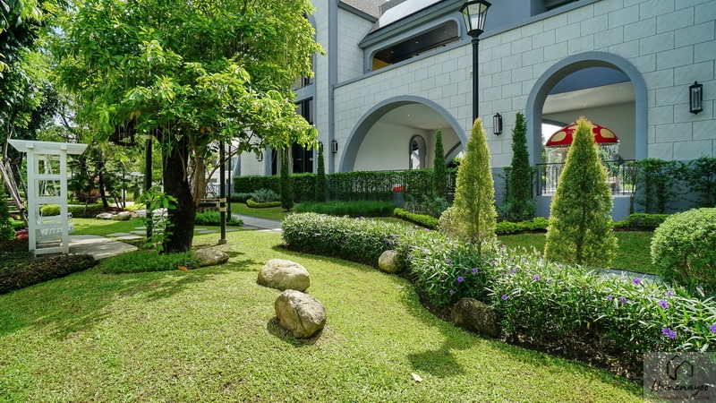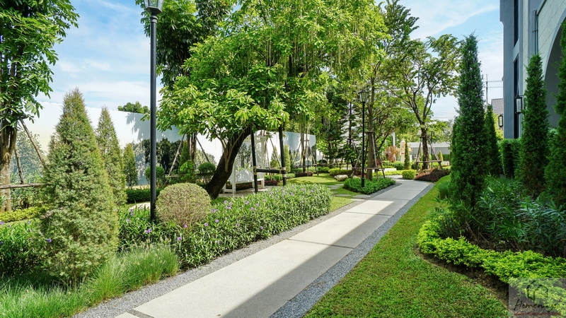 จัด Landscape รอบ ๆ มาอย่างประณีตทั้งสนามหญ้าเขียวตัดแต่งเรียบ, พุ่มไม้ดอกไม้และไม้ทรงกลมเรียงเป็นจังหวะสไตล์สวนยุโรป, ต้นสนสูงเรียว พร้อมตกแต่งด้วยรูปปั้นกวางสีขาวเพิ่มบรรยากาศอบอุ่นและหรูหรา มีป้ายชื่อโครงการตกแต่งบนผนังขนาดใหญ่ โดยเลือกเป็นตัวอักษรสีทองตัดกับพื้นผนังขาวสื่อถึงความพรีเมียม