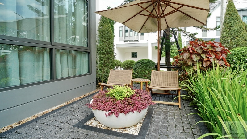 มาดูฝั่งขวาของบ้านกันต่อ ด้านหน้าบ้านตัวอย่างจัดเป็นมุมนั่งเล่นพักผ่อนท่ามกลางบรรยากาศธรรมชาติที่รายล้อมไปด้วยพุ่มไม้ดอกไม้สวยงาม