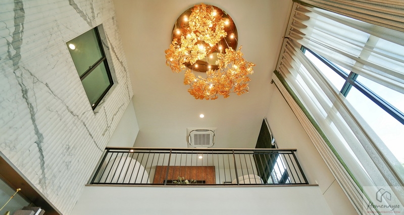 พื้นที่ Double Volume จะเชื่อมต่อไปจนถึง Family Area บนชั้น 2 บ้านตัวอย่างตกแต่งด้วย Chandelier ดีไซน์สวย ๆ ให้ดูเป็นไอเดีย