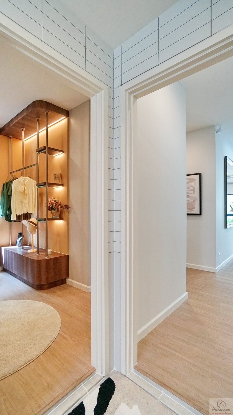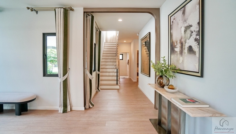 เปิดประตูเข้ามาภายในบ้านจะเจอ Foyer ขนาดกว้างขวางที่ออกแบบให้มีความเป็นส่วนตัว พร้อมเพิ่มพื้นที่ใช้สอยจัดเป็นมุมพักคอยให้ดูเป็นไอเดีย นล่างฝ้าเพดานสูง 2.7 ม. ปูพื้น SPC ลายไม้ ผนังบ้านฉาบเรียบทาสี ใช้หลอด LED ช่วยประหยัดพลังงานทั้งหลัง ผนังด้านข้างมีช่องแสงมาให้ 2 จุด ช่วยทำให้พื้นที่ดูโปร่งมากยิ่งขึ้น