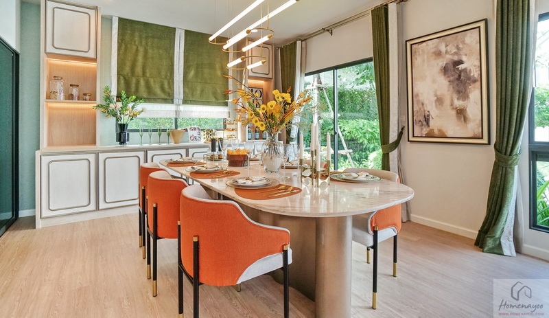 ระยะใช้งานกว้างกำลังดี สามารถเลื่อนเก้าอี้เข้า-ออก, ลุก-นั่ง หรือเคลื่อนย้ายอาหารบนโต๊ะได้อย่างคล่องตัว มีประตูบานเลื่อนเปิดเชื่อมกับสวนข้างตัวบ้านและครัวไทยแบบปิดได้