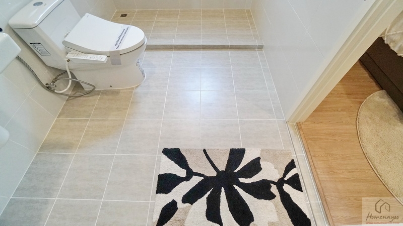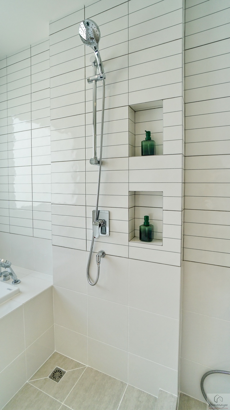 ใกล้กันคือมุมอาบน้ำแยกส่วนแห้ง-ส่วนเปียกด้วยขอบธรณี จุดนี้สามารถติดตั้งฉากหรือม่านกั้นเพิ่มเติมได้ ใช้ฝักบัว Hand Shower มีราวปรับระดับสูง-ต่ำ ด้านข้างเจาะผนังทำเป็นที่วางของใช้ให้ 2 Step บนผนังมีการเดินงานระบบไฟฟ้าติด Junction Box รองรับการติดตั้งเครื่องทำน้ำอุ่นเพิ่มเติม