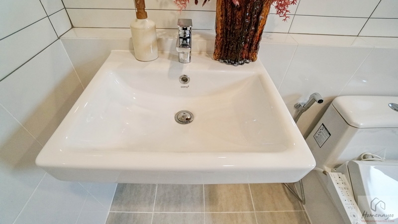 มุมอ่างล้างหน้าใช้ทรงเหลี่ยมแบบแขวนผนังคู่ก็อกน้ำโครเมียมแบบปัดขึ้น ด้านหลังก่อ Low Wall ให้วางของใช้ได้อีก บนผนังติดกระจกเงาบานใหญ่เต็มพื้นที่ให้ 1 บาน