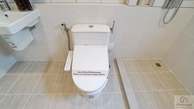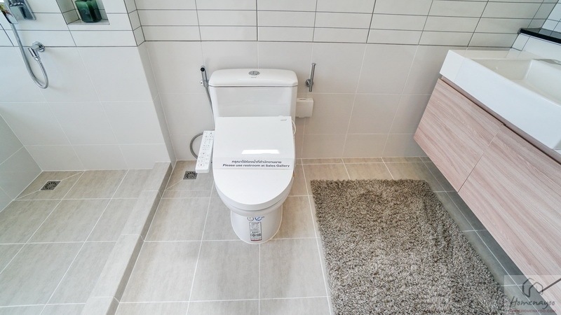ด้านข้างคือมุมโถสุขภัณฑ์ระบบ Dual Flush ฝารองนั่งอัตโนมัติ ระยะการนั่งใช้งานสะดวกสบาย ติดตั้งสายฉีดชำระและแกนแขวนกระดาษทิชชูให้ครบชุด