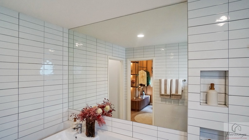 มุมอ่างล้างหน้าใช้ทรงเหลี่ยมแบบฝังผนังคู่ก็อกน้ำแบบปัดขึ้น ด้านหลังก่อ Low Wall ให้วางของใช้ได้เยอะ บนผนังติดกระจกเงาทรงสี่เหลี่ยมบานใหญ่เต็มพื้นที่ให้ 1 บาน