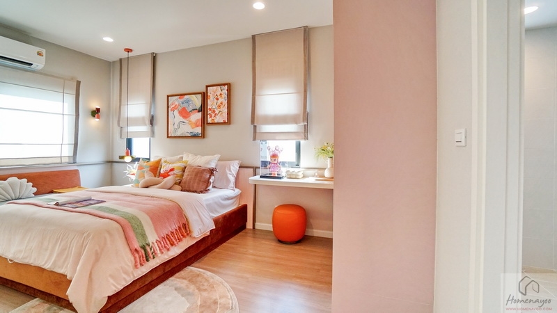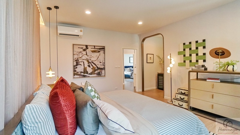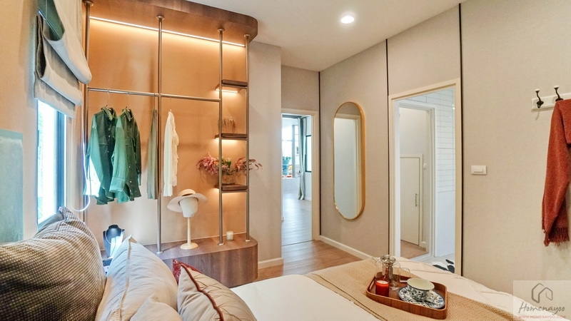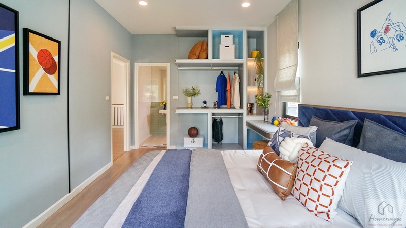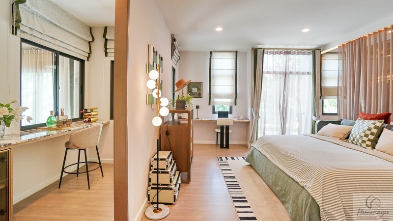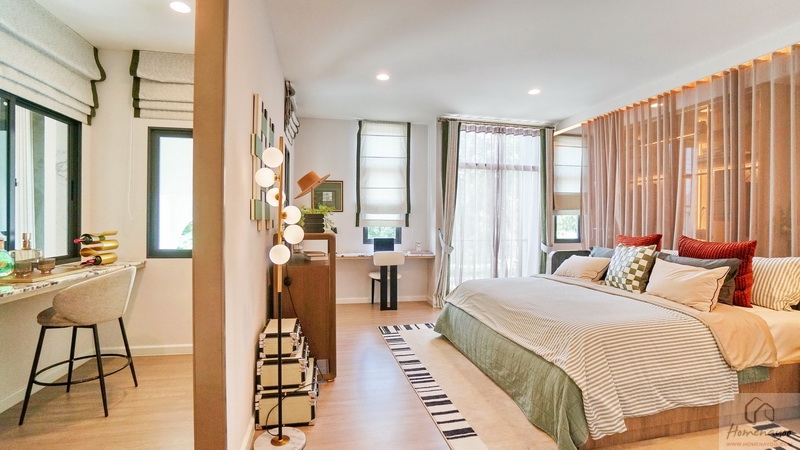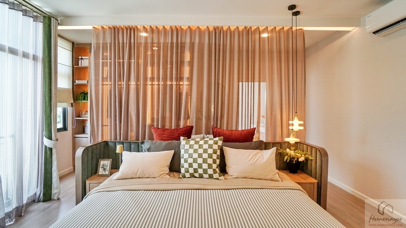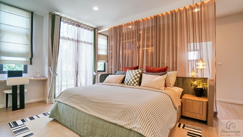 ฝั่งหัวเตียงวางโต๊ะด้านข้างได้ทั้ง 2 ฝั่ง ด้านหลังบ้านตัวอย่างกั้นส่วนด้วยม่านโปร่งดูหรูหราระหว่างเตียงนอนกับ Walk-in Closet