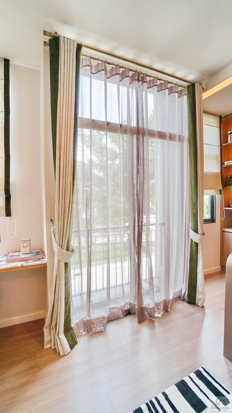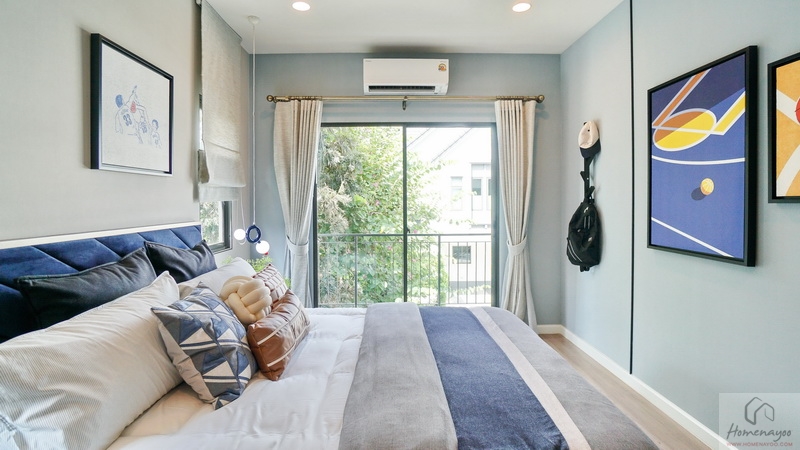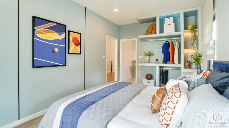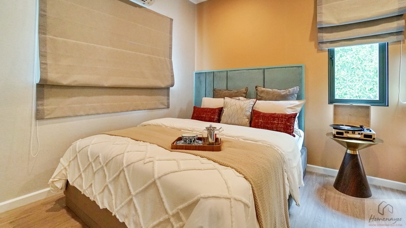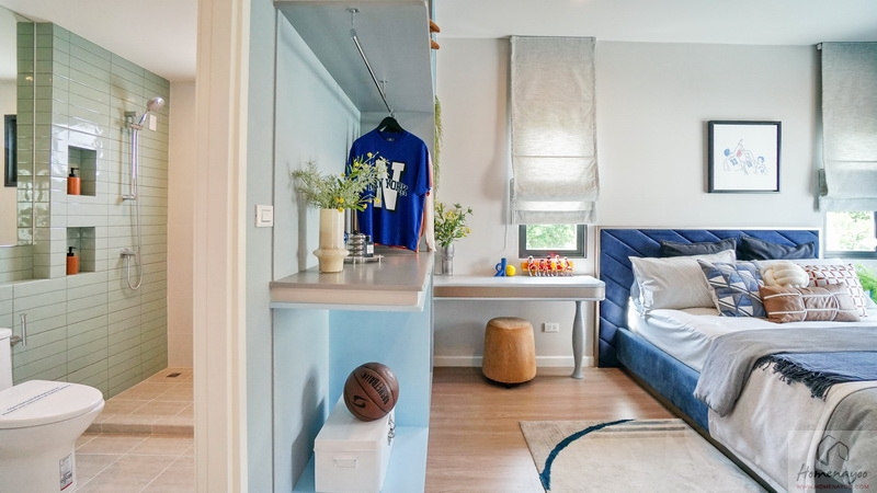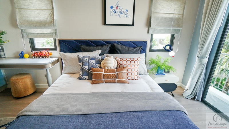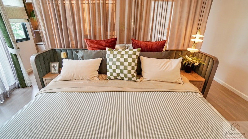 ฝั่งหัวเตียงวางโต๊ะด้านข้างได้ทั้ง 2 ฝั่ง ด้านหลังบ้านตัวอย่างกั้นส่วนด้วยม่านโปร่งดูหรูหราระหว่างเตียงนอนกับ Walk-in Closet