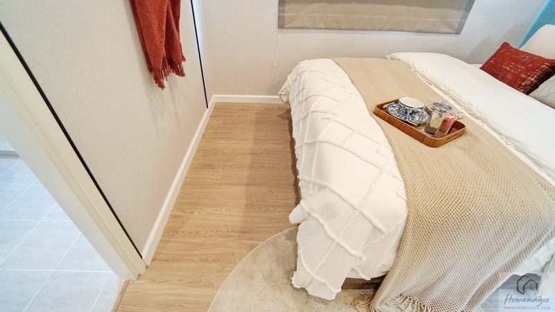 ฝั่งหัวเตียงบ้านตัวอย่างวางโต๊ะด้านข้างไว้ 1 ฝั่งให้ดูระยะการใช้งาน