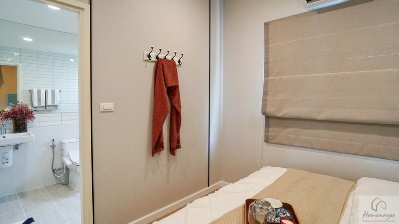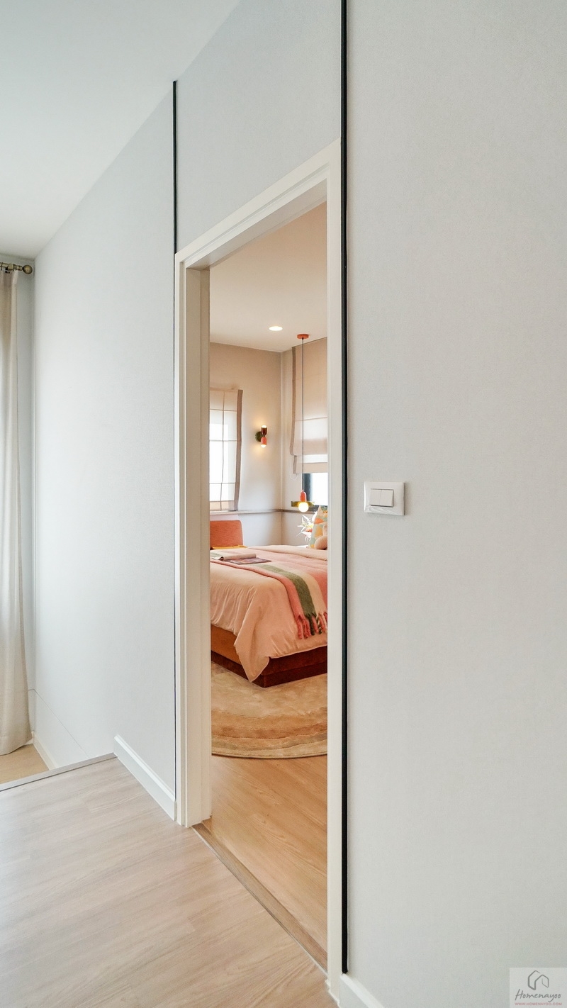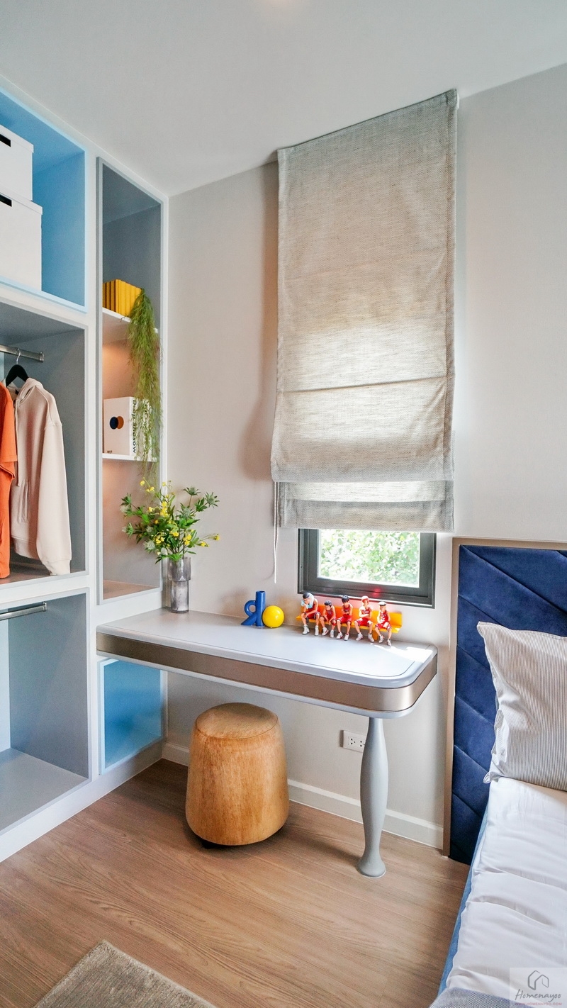 ด้านข้าง Built-in ตู้เสื้อผ้าขนาดกลาง หรือจะนำโต๊ะข้างเตียงออกแล้วปรับเป็นมุมโต๊ะทำงานขนาดกะทัดรัดก็ตอบโจทย์