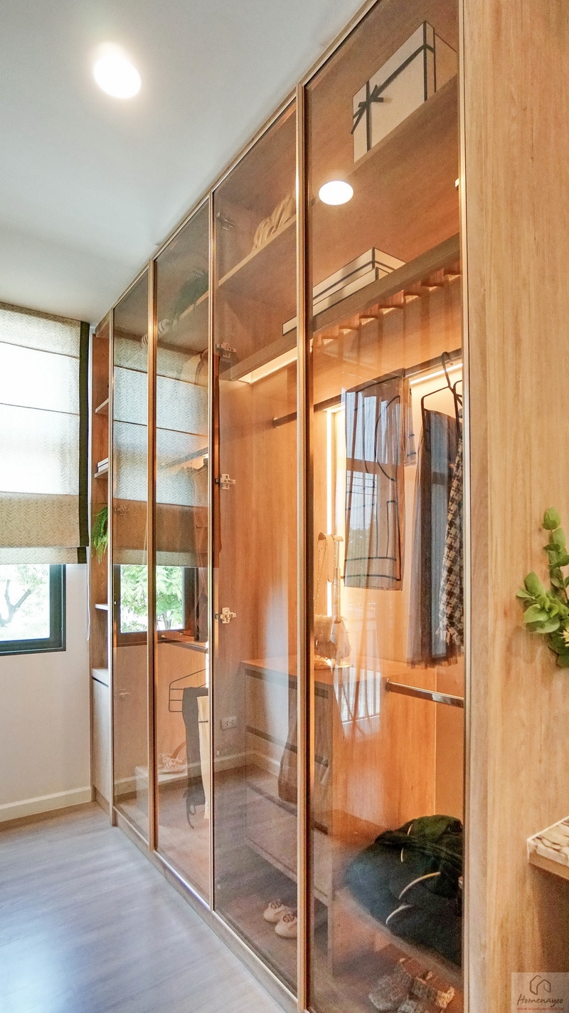 บ้านตัวอย่าง Built-in ตู้เสื้อผ้าบานเปิดทรงสูงจรดเพดานหน้าบานกระจกใสสีชาหรูหราขนาดใหญ่