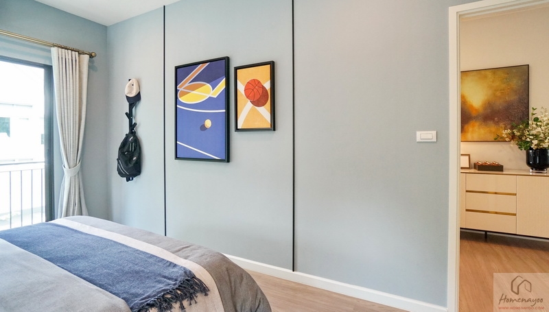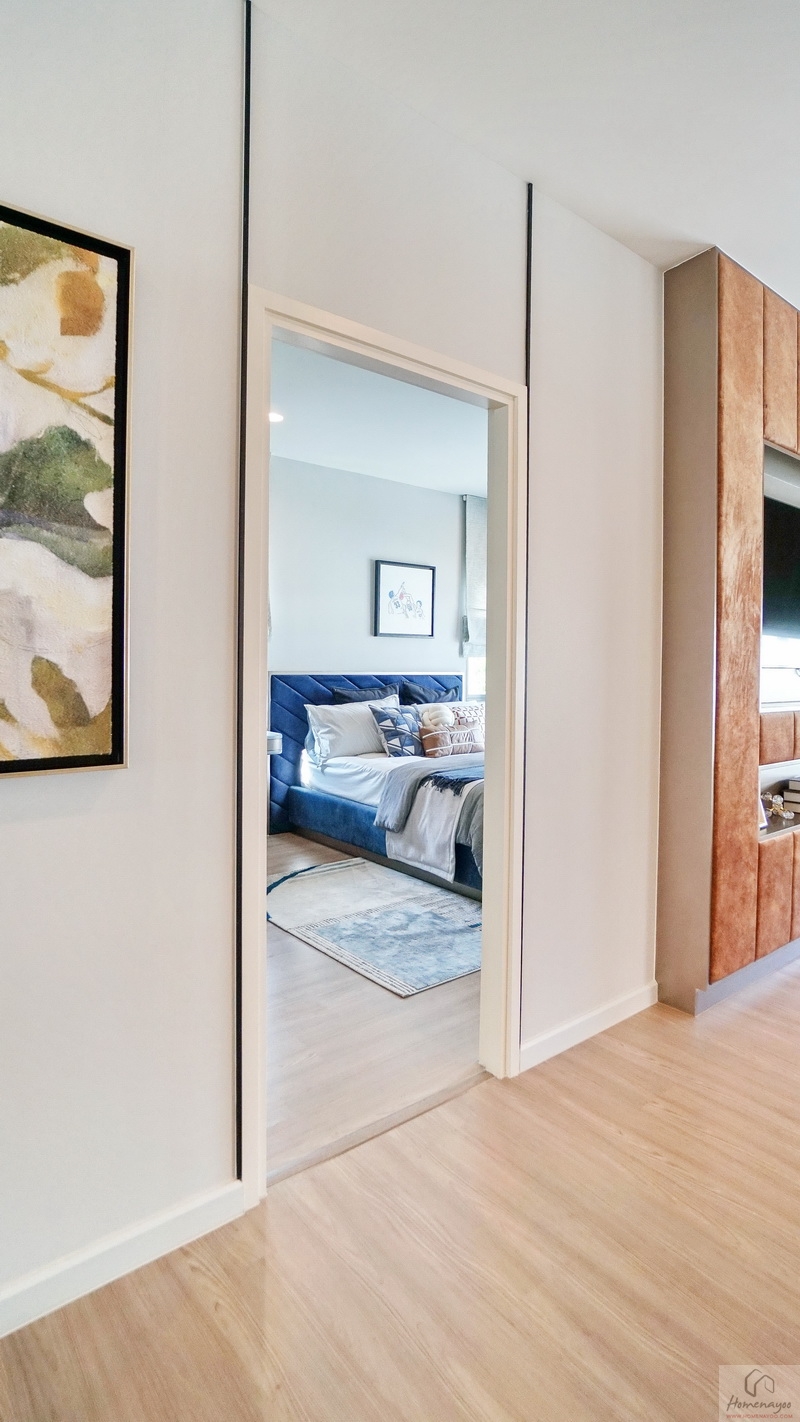 ฝั่งปลายเตียงผนังกว้างสามารถ Built-in เป็นชั้นวางทีวีขนาดใหญ่ หรือวาง Sideboard ดีไซน์เก๋ ๆ ที่ชอบได้เลย พื้นปลายเตียงมีระยะให้เดินเข้า-ออกได้สะดวก