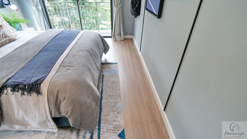 ภายในห้องพื้นที่ใช้งานกว้างกำลังดี จัดวางเฟอร์นิเจอร์มาตรฐานต่าง ๆ ได้แบบครบครัน ปูพื้น SPC ลายไม้เพิ่มความอบอุ่นให้กับตัวห้อง