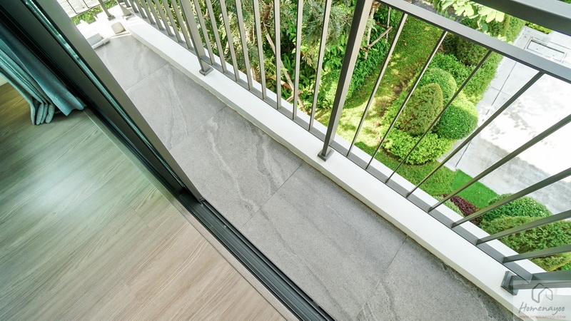 ประตูบานเลื่อนยกสูงขึ้นมาเล็กน้อยจากพื้นระเบียง ช่วยป้องกันฝุ่น, ความชื้น และสิ่งสกปรกต่าง ๆ พัดเข้าสู่ด้านในห้อง พื้นปูกระเบื้องสวยงาม พื้นที่ใช้งานค่อนข้างจำกัดนิดหน่อย ติดราวกันตกเป็นซี่เหล็กโปร่งทาสีดำมาให้