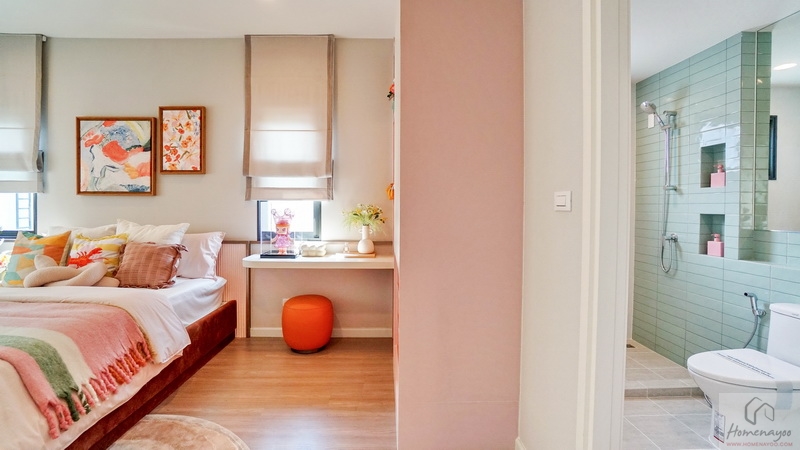 ขณะที่ห้องน้ำในตัวตกแต่งมาสไตล์เดียวกับห้องนอน 2 ฟังก์ชันครบทั้งโซนอ่างล้างหน้า, โซนอาบน้ำ, มุมโถสุขภัณฑ์, หน้าต่างช่วยระบายอากาศ แยกส่วนแห้ง-ส่วนเปียกด้วยขอบธรณีที่สามารถติดตั้งฉากหรือม่านกั้นได้ค่ะ