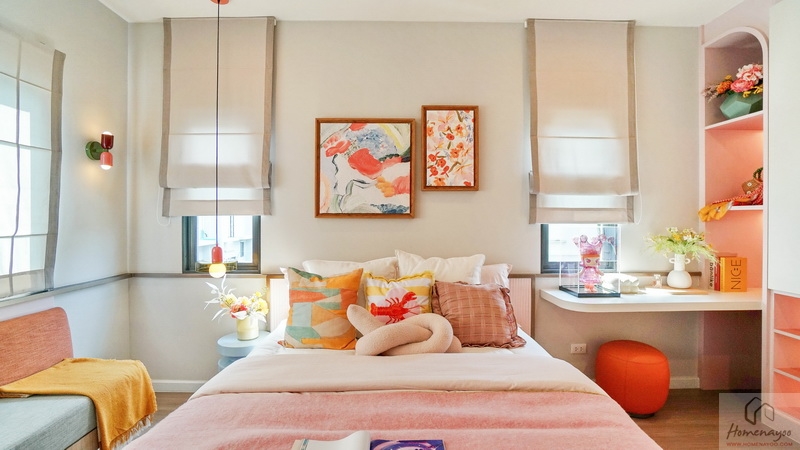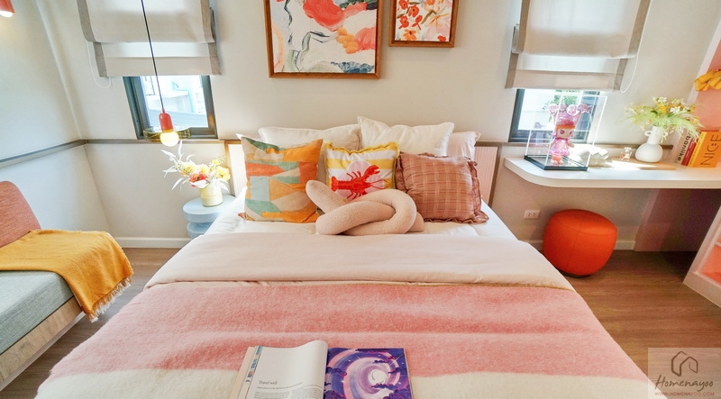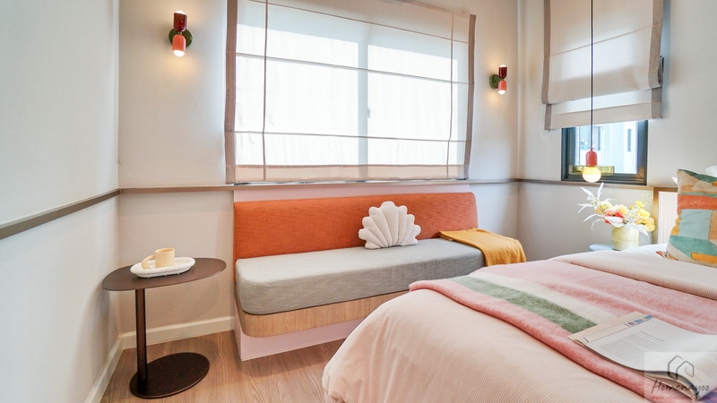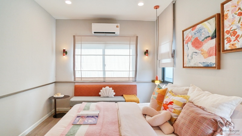ฝั่งหัวเตียงมีหน้าต่างบานกระทุ้งช่วยรับแสงรับลมให้ถึง 2 ชุด ด้านข้างวางโต๊ะขนาดกะทัดรัดไว้ 1 ฝั่งให้ดูระยะการใช้งาน