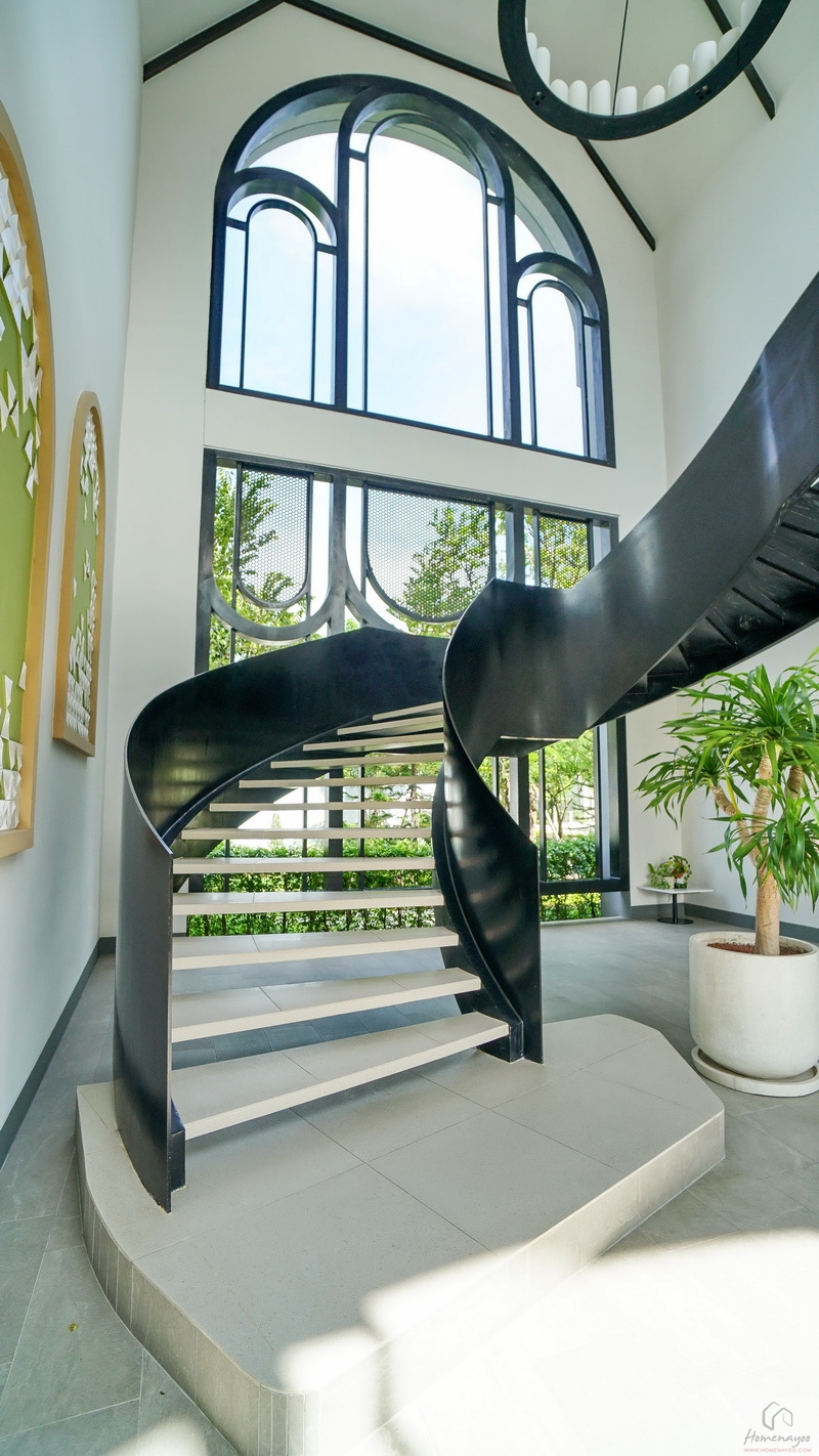 โถงบันไดบ้านสูงโปร่งรับแสงจากภายนอกเข้ามาได้อย่างเต็มที่จากหน้าต่างบานผสมทรงสูงขนาด Oversize