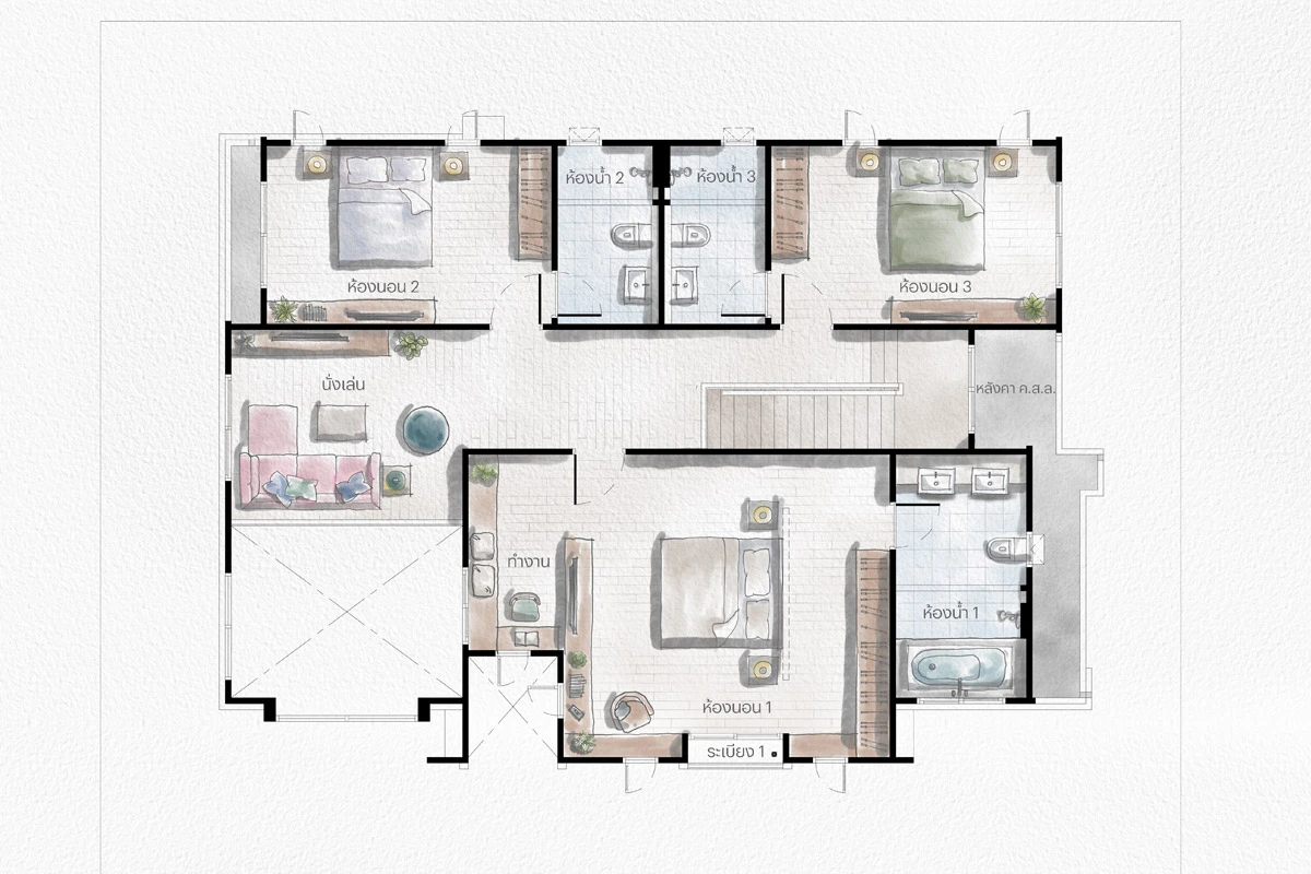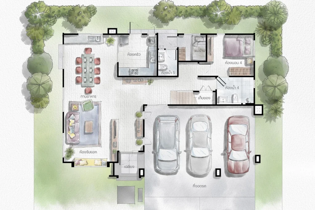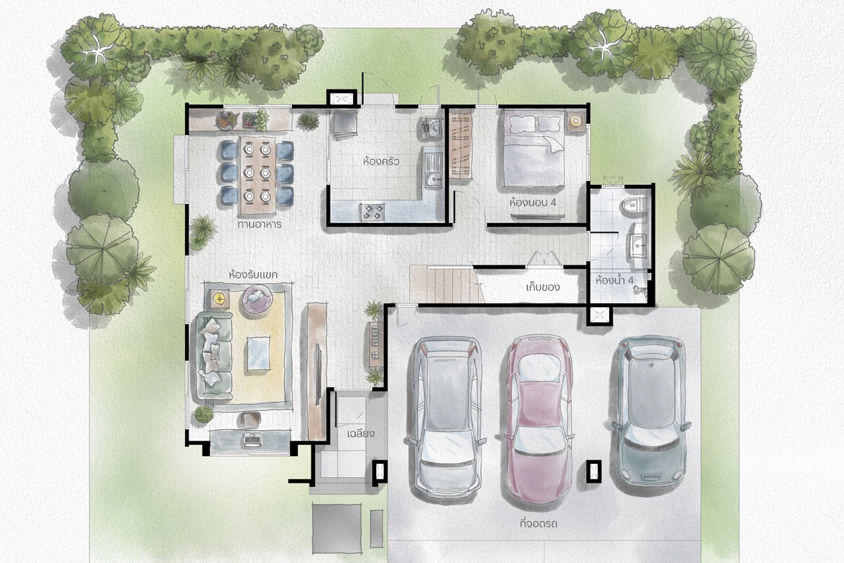 • ฟังก์ชันบ้าน 4 ห้องนอน, 4 ห้องน้ำ, 1 ห้องแม่บ้าน พร้อมที่จอดรถ 3 คัน