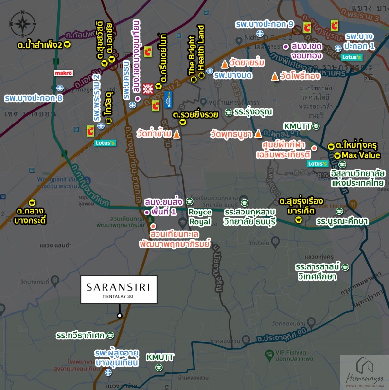 ทำเลที่ตั้งโครงการ สราญสิริ เทียนทะเล 30 ตั้งอยู่ภายในซอยเทียนทะเล 30 ตามชื่อของโครงการเลยค่ะ โดยโครงการจะยังอยู่ในเขตพื้นที่ของกรุงเทพฯ ที่ออกไปโซนชานเมืองหน่อย ทำให้ได้พื้นที่ดินของบ้านขนาด 100 ตร.ว. ขึ้นไป ในราคาที่เบาลงมาจากโครงการที่เกาะติดเส้นพระราม 2 อยู่มาก แต่ก็ยังเป็นทำเลที่อยู่อาศัยได้ง่าย เพราะมีสิ่งอำนวยความสะดวกบนเส้นพระราม 2 อยู่ค่อนข้างเยอะ และถ้ามองในแง่ของการพักผ่อนอยู่อาศัยก็นับว่าดี เพราะพื้นที่ที่ติดกับโครงการจริง ๆ ส่วนใหญ่จะเป็นที่ดินเปล่า และอยู่ในเขตผังเมืองที่มีความหนาแน่นต่ำ ทำให้ได้ความเป็นส่วนตัวสูงค่ะ