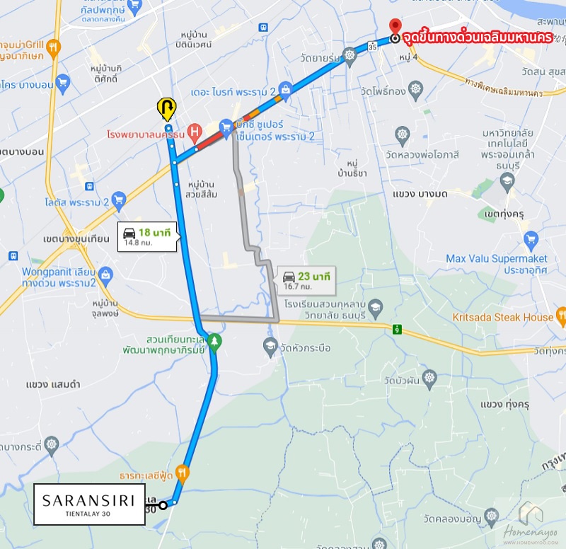 การเดินทางด้วยรถสาธารณะ การเดินทางของทำเลนี้ต้องใช้รถยนต์ส่วนตัวเป็นหลัก คนที่เข้ามาอยู่ในทำเลนี้ก็น่าจะใช้รถส่วนตัวกันอยู่แล้ว ดังนั้นการเดินทางด้วยรถสาธารณะน่าจะไม่ใช่ประเด็นสำคัญอะไร แต่ก็มีตัวเลือกอย่างการเรียกแท็กซี่ผ่านทางแอปพลิเคชันต่าง ๆ จะสะดวกกว่า หรือออกไปที่ถนนพระราม 2 อย่างตรงหน้า Central พระราม 2 จะมีสถานีสถานีรถตู้โดยสาร มีหลายสายให้เลือกเดินทางไปได้ตามโซนต่าง ๆ ของกรุงเทพฯ และปริมณฑลเลยค่ะ