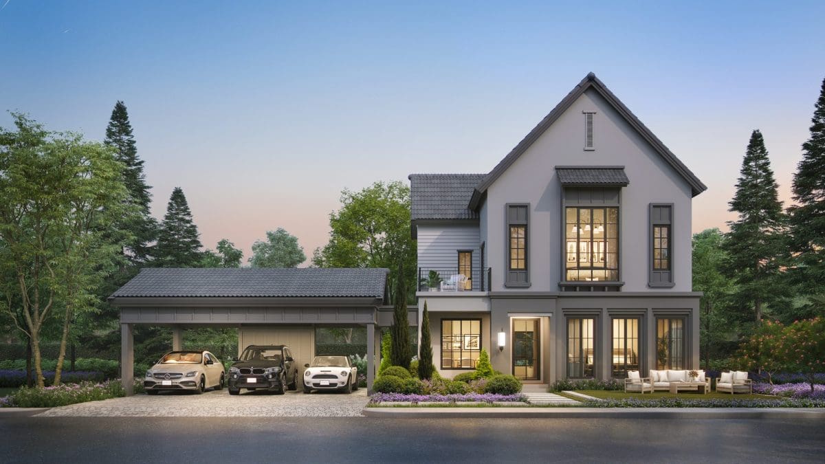โรงจอดรถถูกแยกออกมาจากตัวบ้าน สามารถจอดรถได้ 3 คันในร่ม แต่บางหลังที่ได้แปลงที่ดินขนาดใหญ่ ก็จอดรถซ้อนคันเพิ่มได้เป็น 6 คันเลย ส่วนด้านหลังโรงจอดรถก็ออกแบบมาให้เป็นตู้เก็บของค่ะ