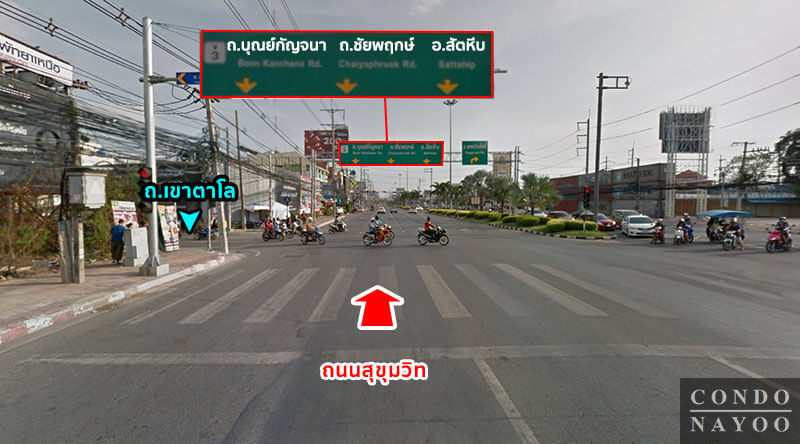 จากนั้นวิ่งตรงตามป้ายไป ถ.บุณย์กัญจนา ถ.ชัยพฤกษ์ อ.สัตหีบ