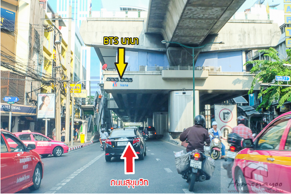 เริ่มจากแยกอโศก มุ่งหน้าไปสยาม ขับตรงผ่านแยกไปตรงหน้าจะเป็น BTS อโศก ขวามือเป็น Terminal 21 และ MRT อโศก