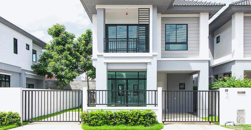 ประตูรั้วหน้าบ้านจะเป็นแบบพับ 4 ตอน หน้าบ้านมี Mail Box และป้ายเลขที่บ้าน ขวามือมีช่องทิ้งขยะ