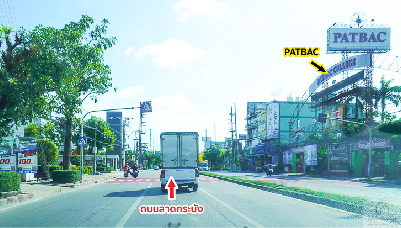 ลงสะพานมาเชื่อมเข้าถนนลาดกระบัง ขวามือเป็นวิทยาลัยเทคโนโลยีพัฒน์อ่อนนุชบริหาร