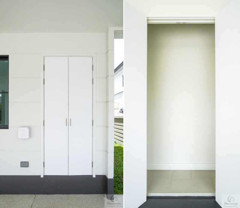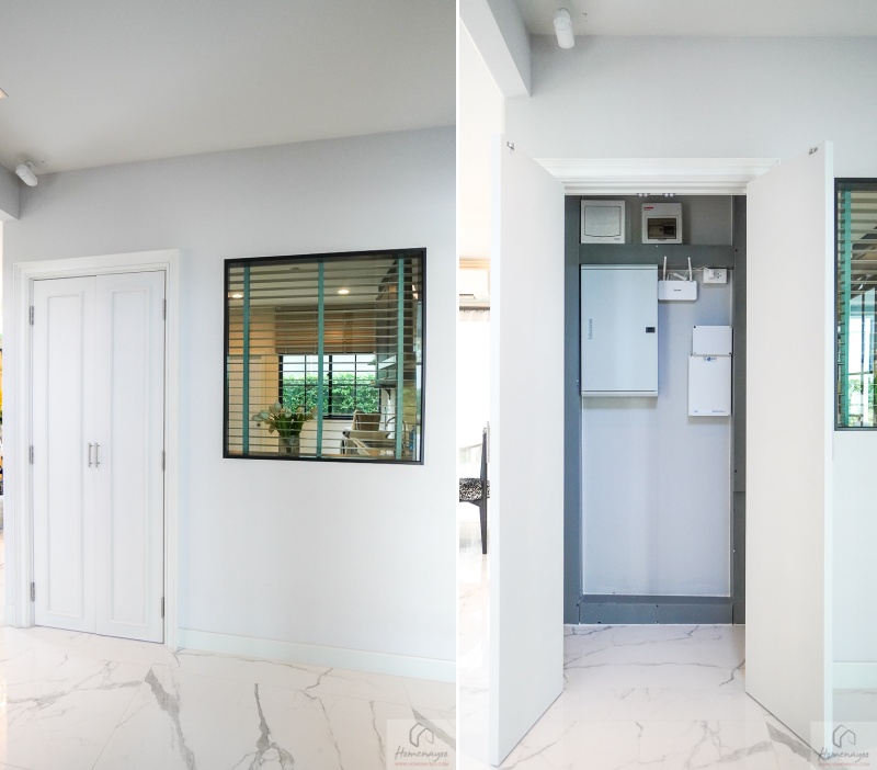 ติดกับห้องน้ำเป็นตู้เก็บของ เป็นตู้บานเปิด 2 บาน ด้านในเก็บของได้และยังซ่อนะบบควบคุมไฟต่าง ๆ ในบ้านไว้อีกด้วย