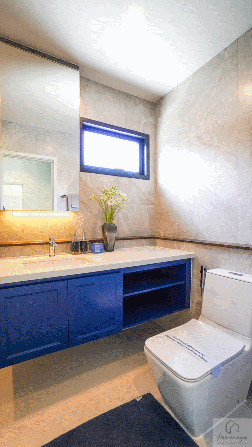 ห้องน้ำเป็นแบบ Powder Room คือไม่มีพื้นที่ส่วนเปียก พื้นและผนัง ตกแต่งด้วยกระเบื้องโทนสีเบจดูสบายตา ในห้องน้ำมีช่องแสงเป็นบานกระทุ้ง เปิดระบายอากาศได้