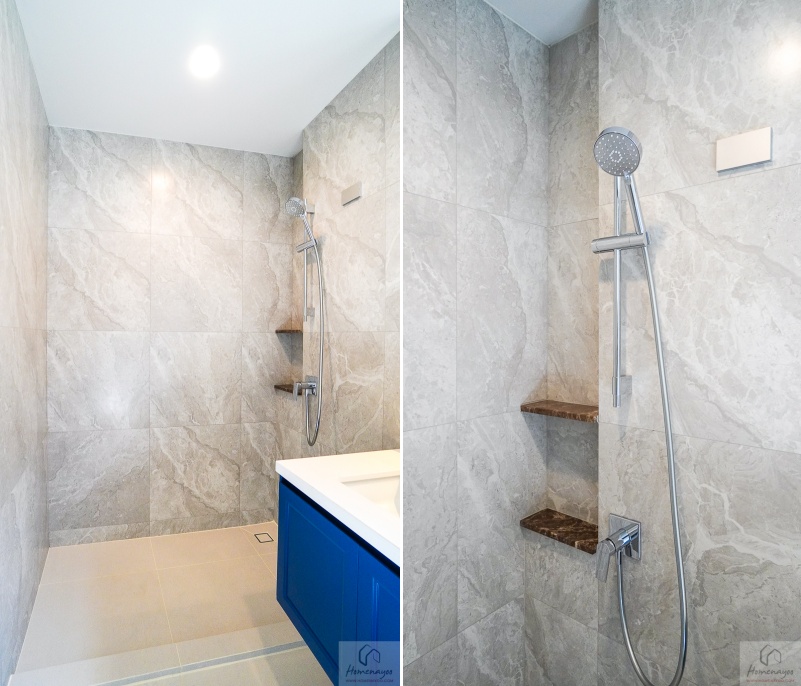 ถัดไปเป็นพื้นที่ส่วนเปียก ด้านในติดตั้ง Hand Shower พร้อมเดินงานระบบไฟฟ้าติด Junction Box รองรับการติดตั้งเครื่องทำน้ำอุ่นมาให้เรียบร้อย พร้อมช่องวางอุปกรณ์อาบน้ำด้านข้าง