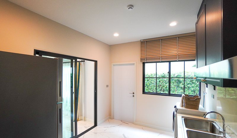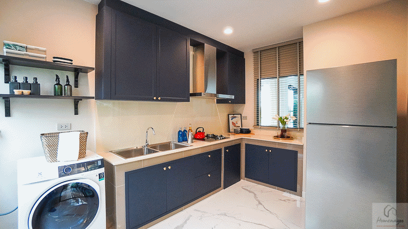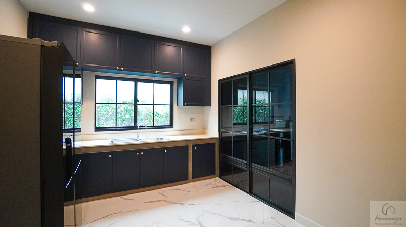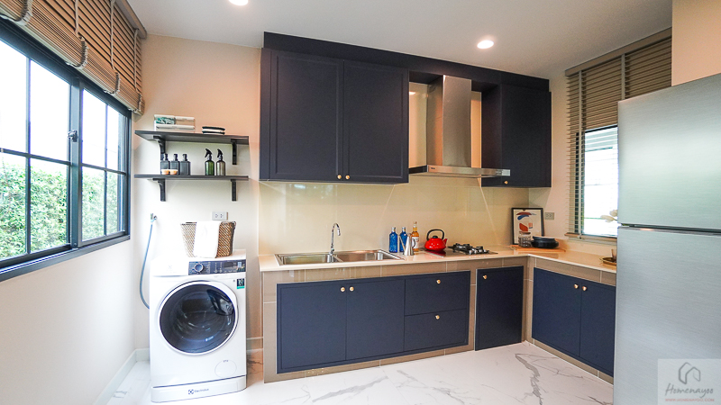 จากส่วนครัวจะมีประตูเปิดเชื่อมออกไปยังส่วนซักล้างในร่ม และห้องแม่บ้านหลังบ้านได้
